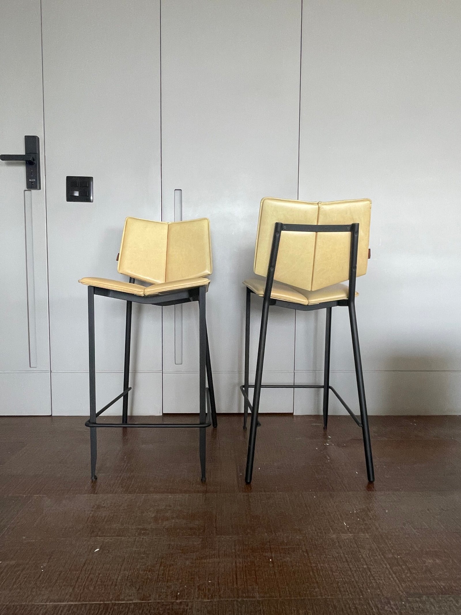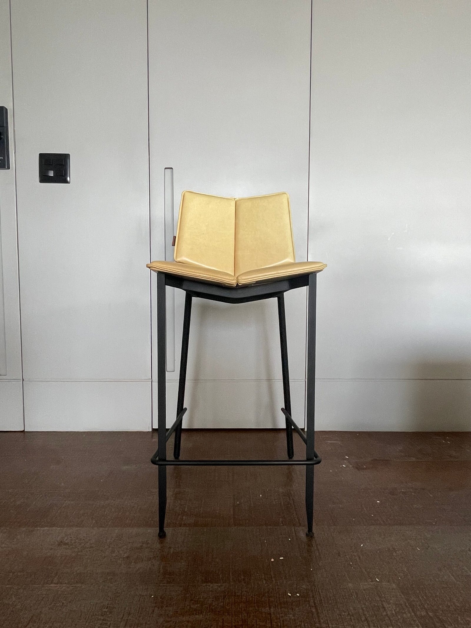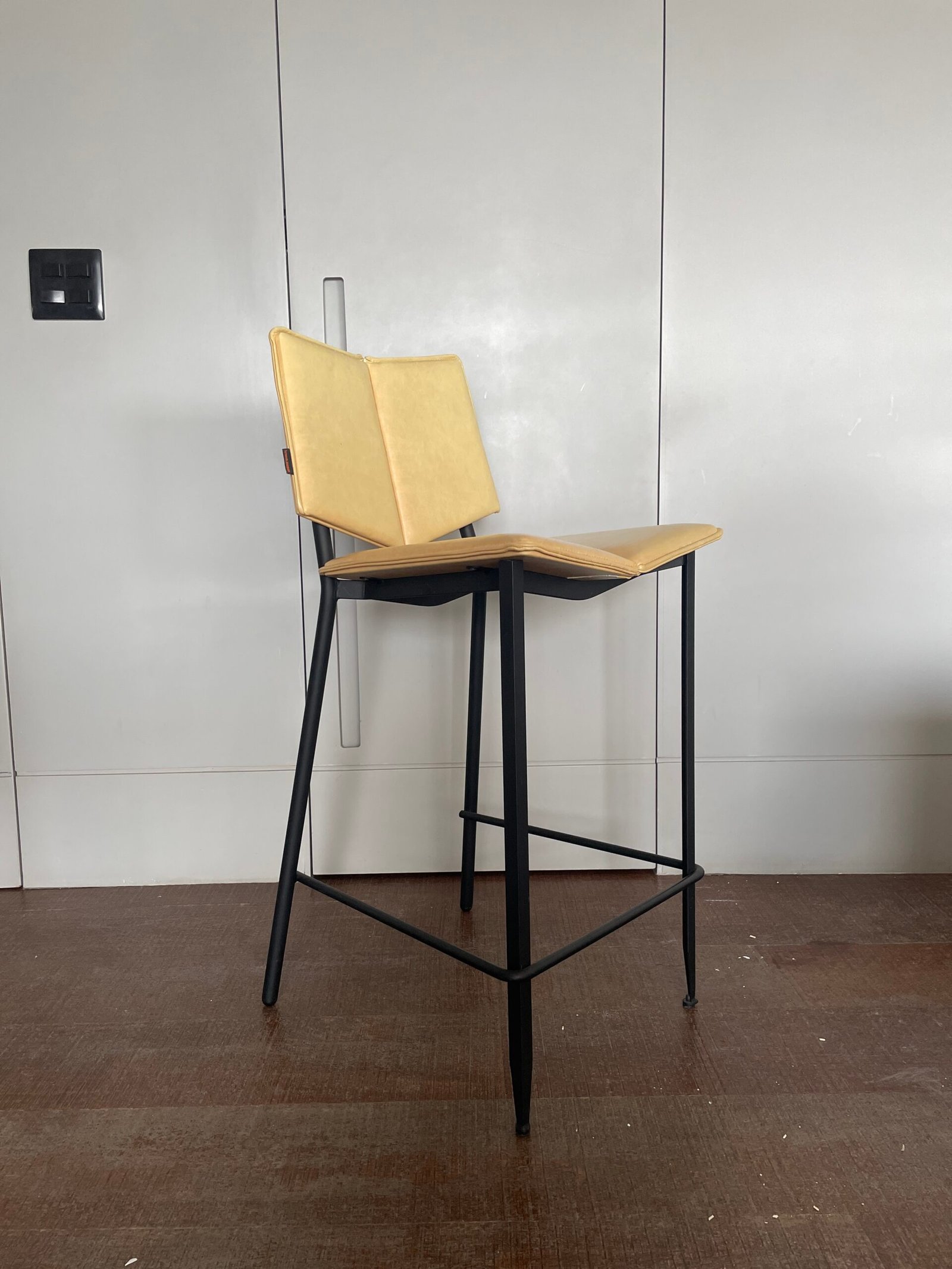 Cód: resflosp02 DESCRIÇÃO: 02 Banquetas Nômade Estofada Designer: Fernando Jaeger Estrutura: aço carbono Tecido: couro Cor: camarelo claro