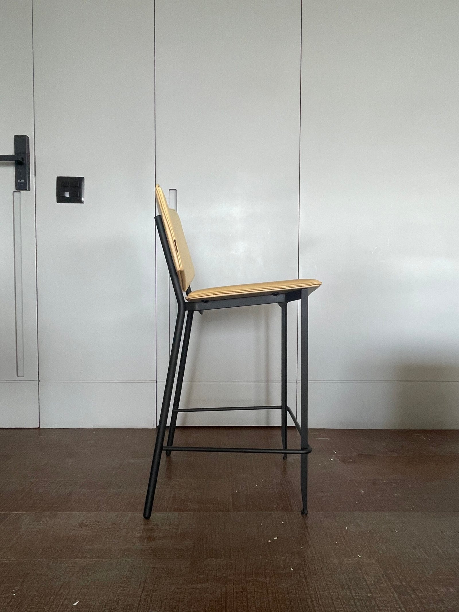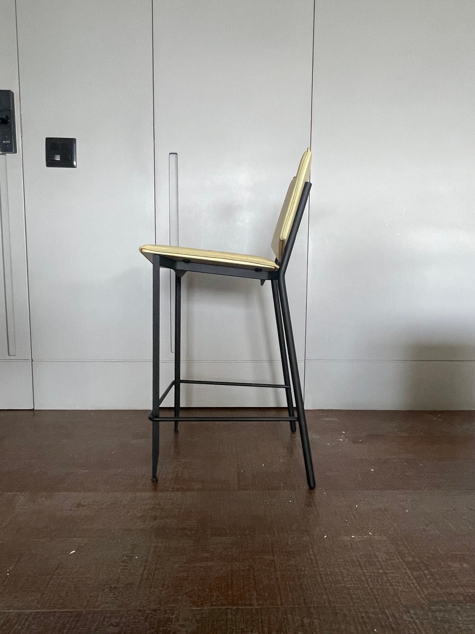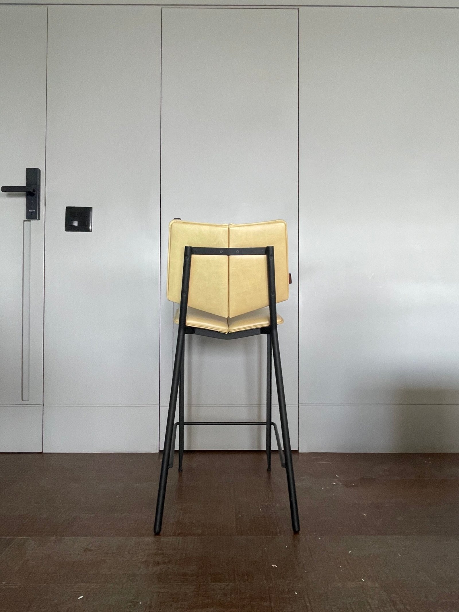Cód: resflosp02 DESCRIÇÃO: 02 Banquetas Nômade Estofada Designer: Fernando Jaeger Estrutura: aço carbono Tecido: couro Cor: camarelo claro