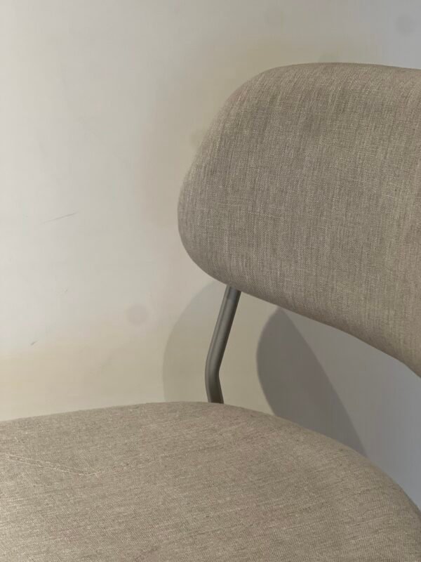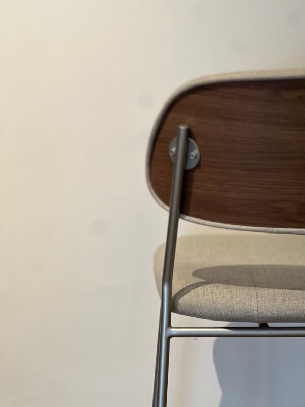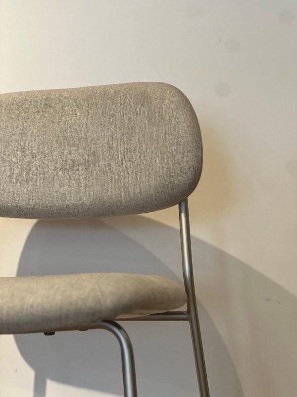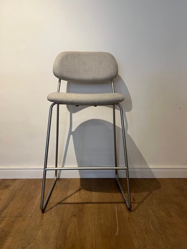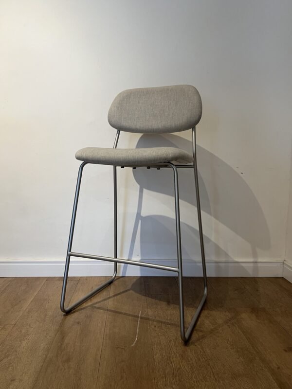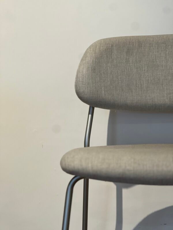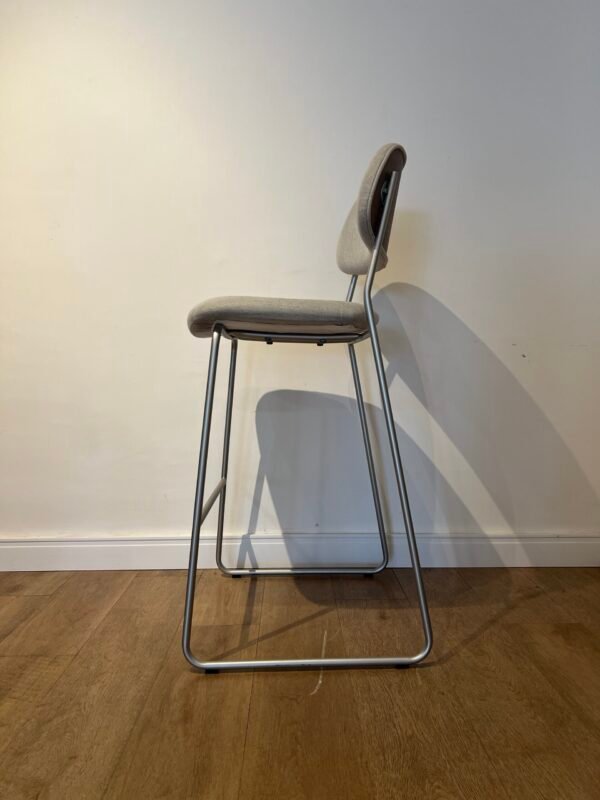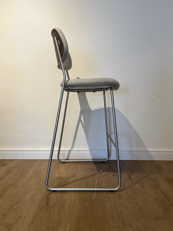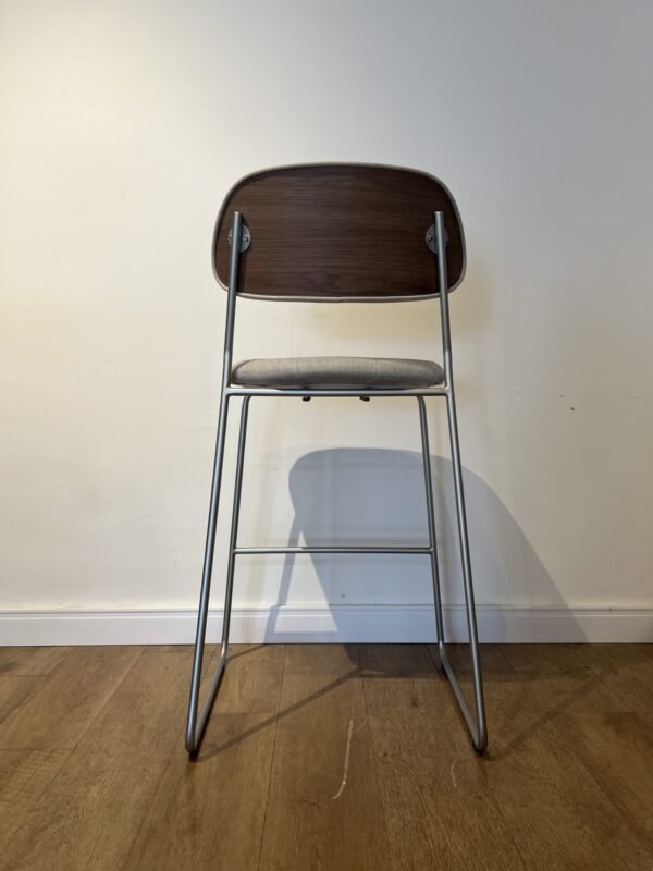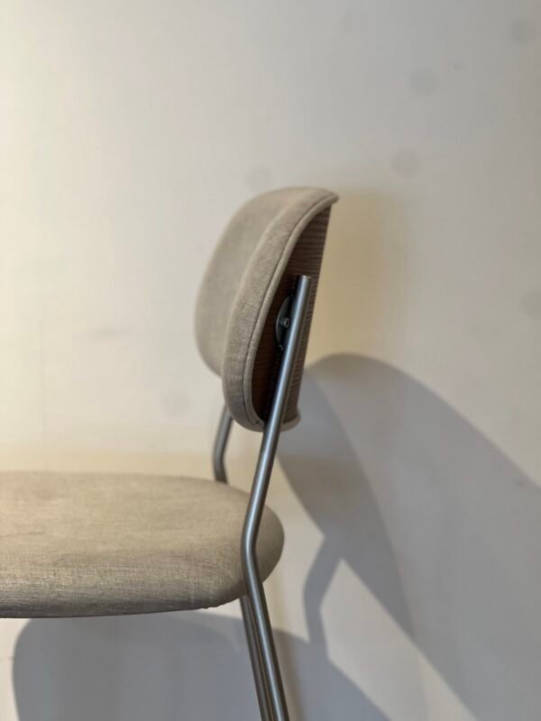 Cód: spacosp71 DESCRIÇÃO: Banqueta Yoko Designer: Bruno Debenetti Costas em madeira laminada Nogueira Estrutura: aço carbono em pintura prata Tecido: linho Cor: cinza claro