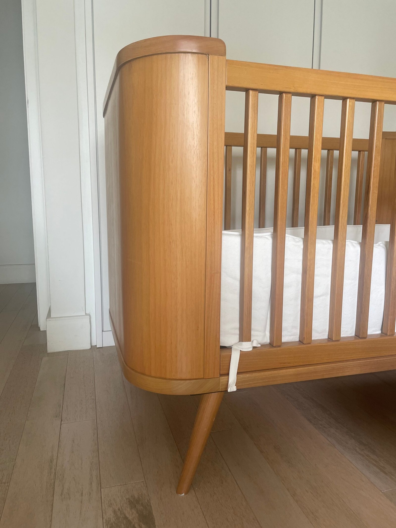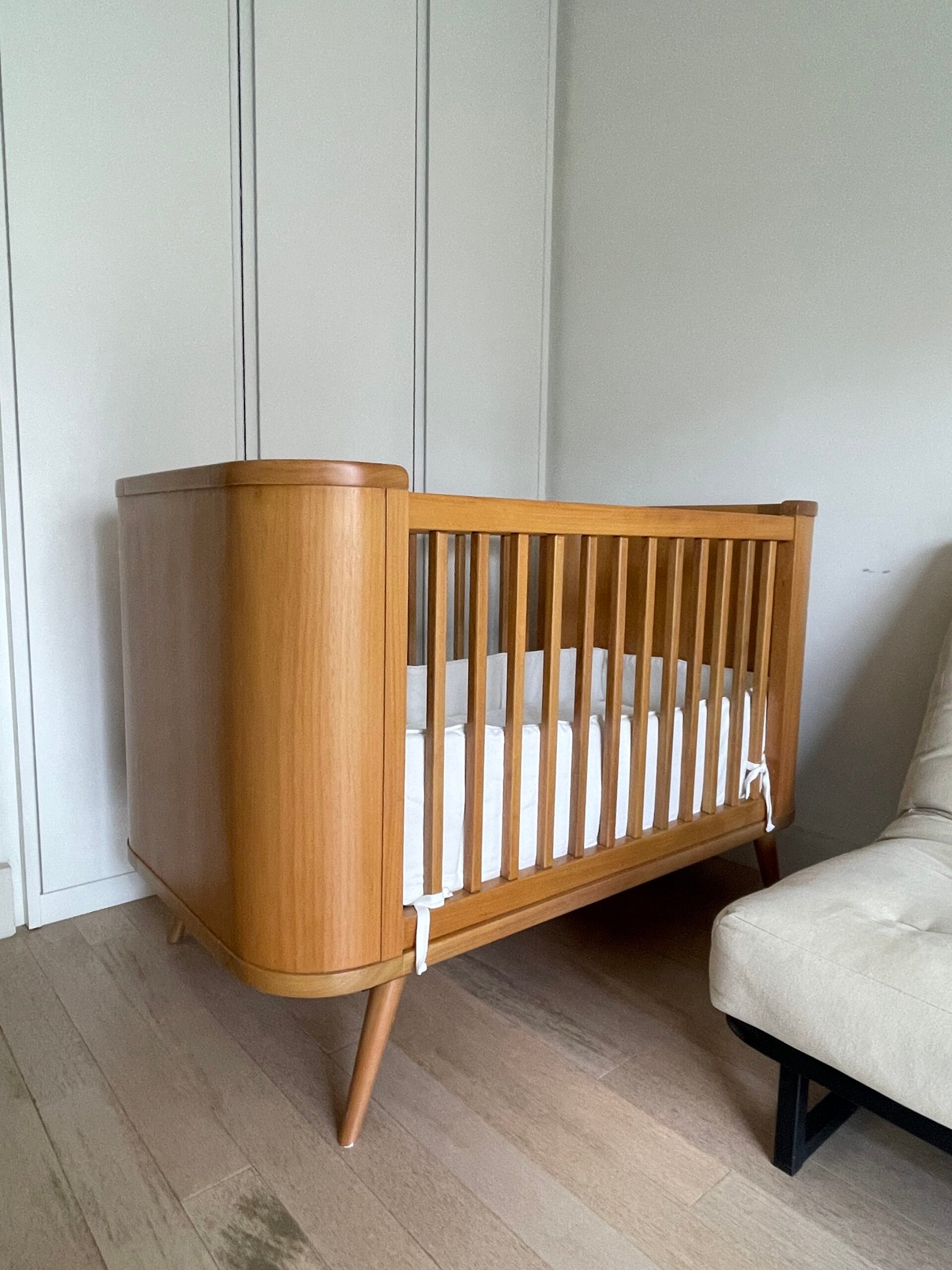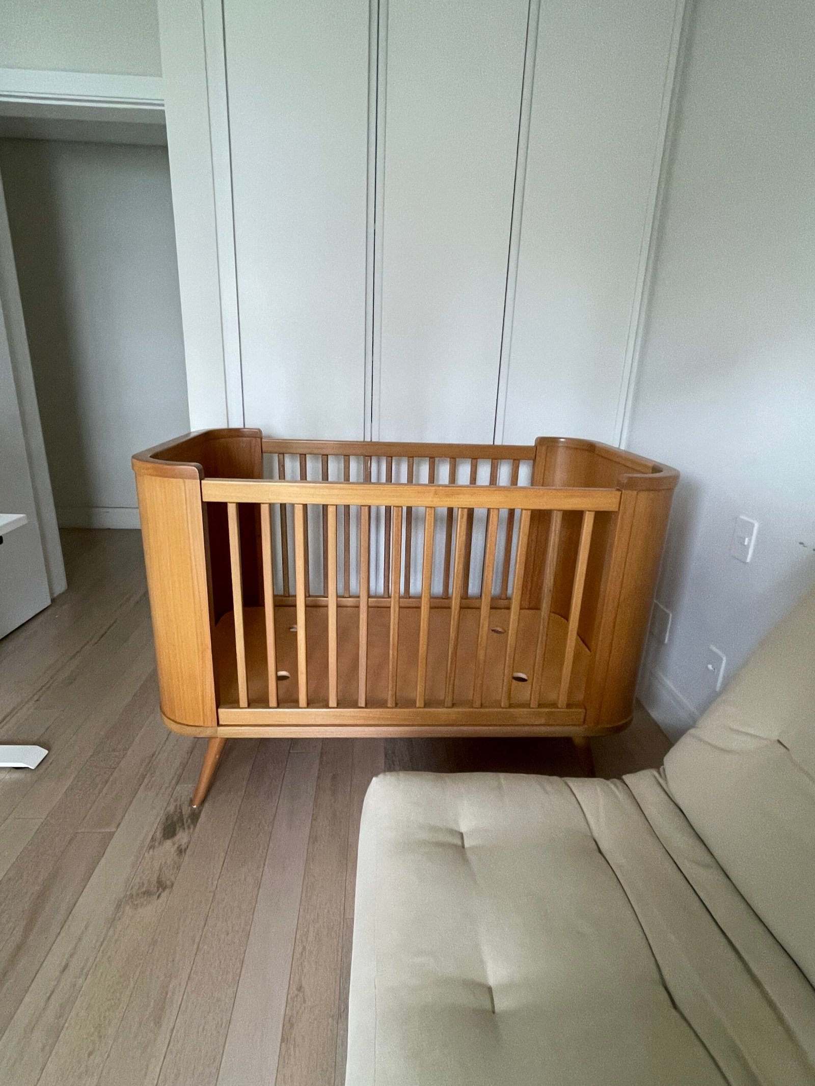 Cód: neracsp01 DESCRIÇÃO: Berço 50’s – Berço – Mini cama 3 alturas internas do colchão Estrutura: madeira maciça jequitibá Cor: manteiga