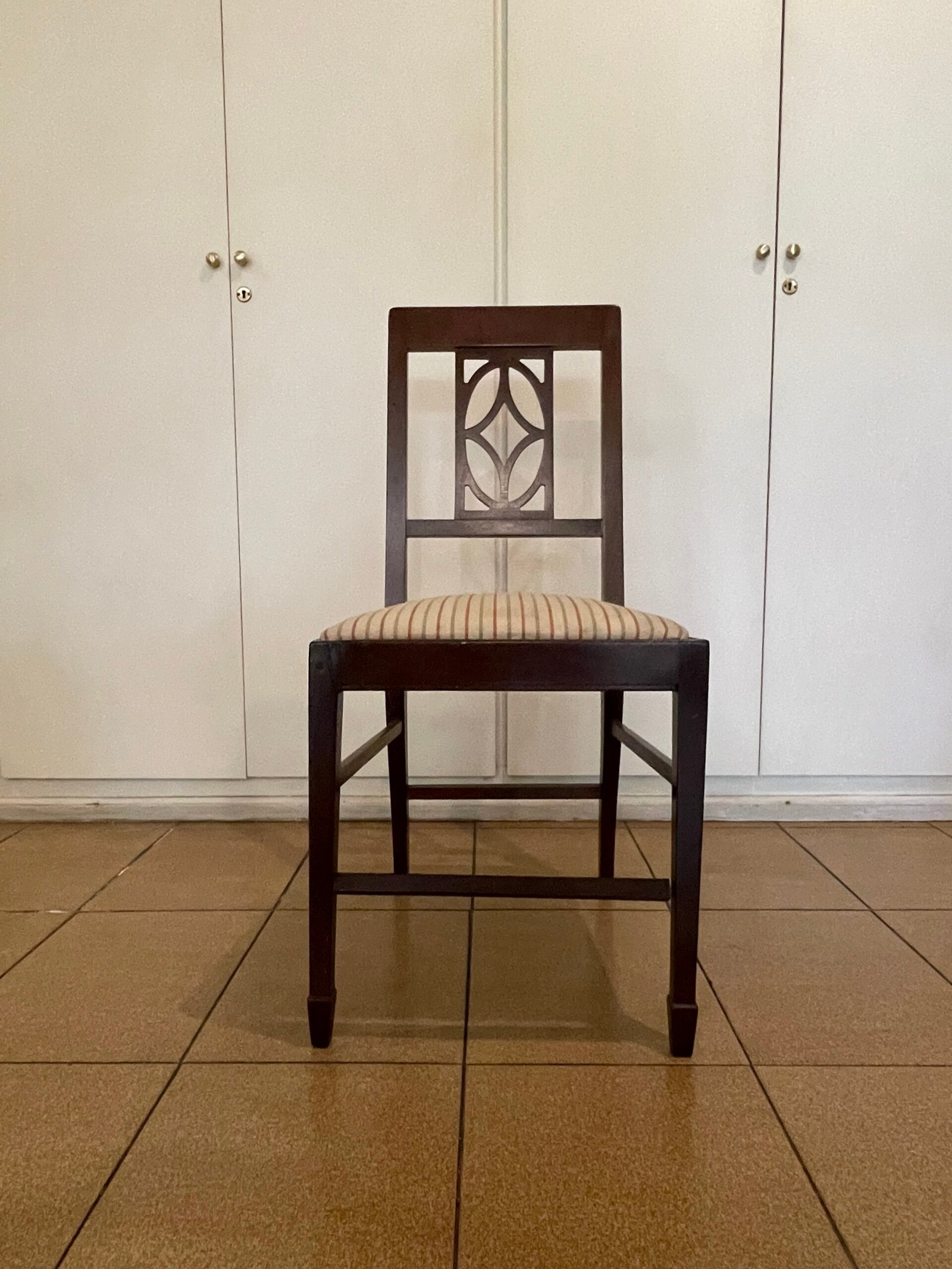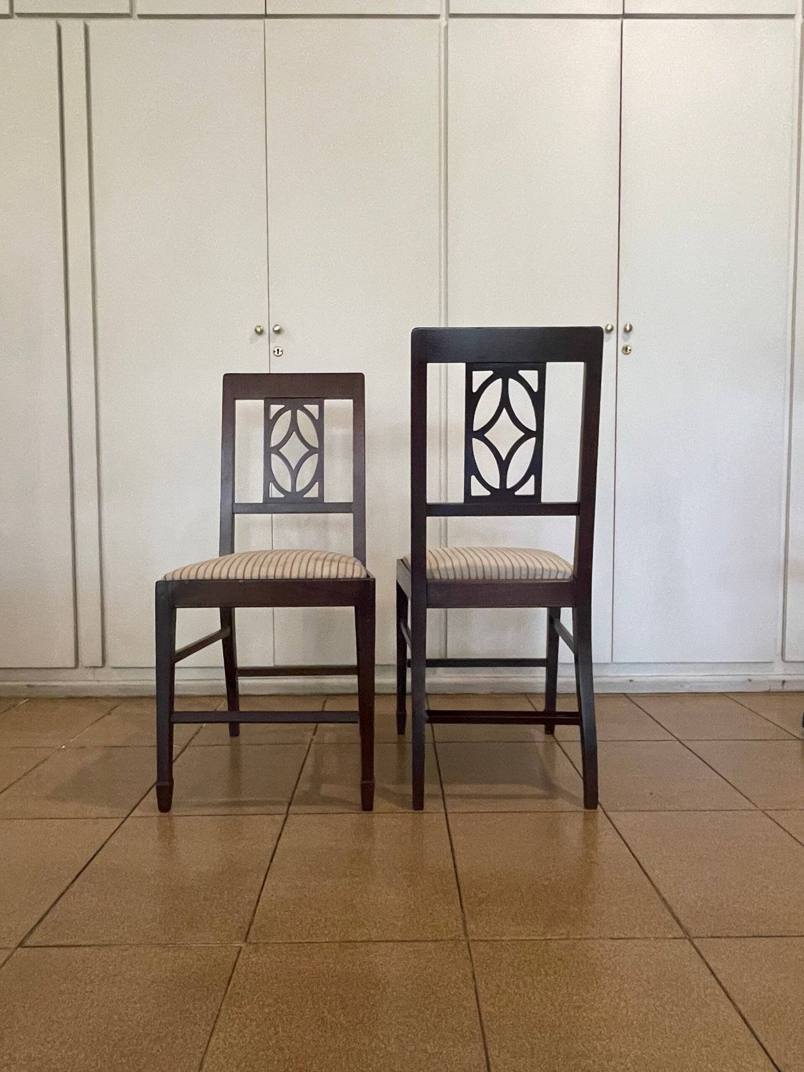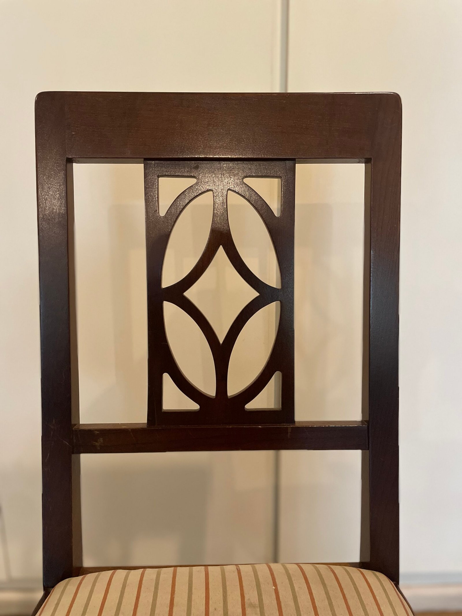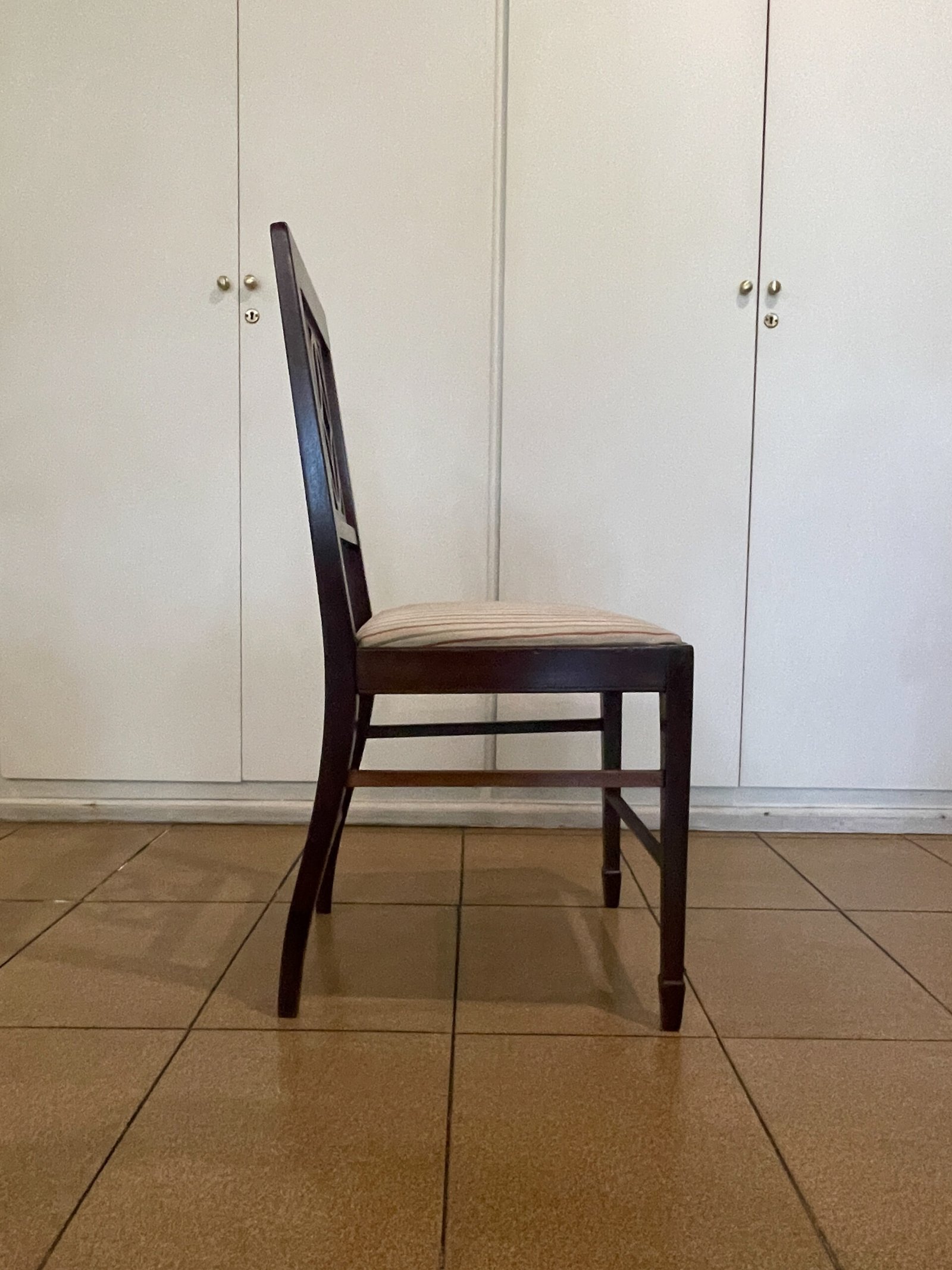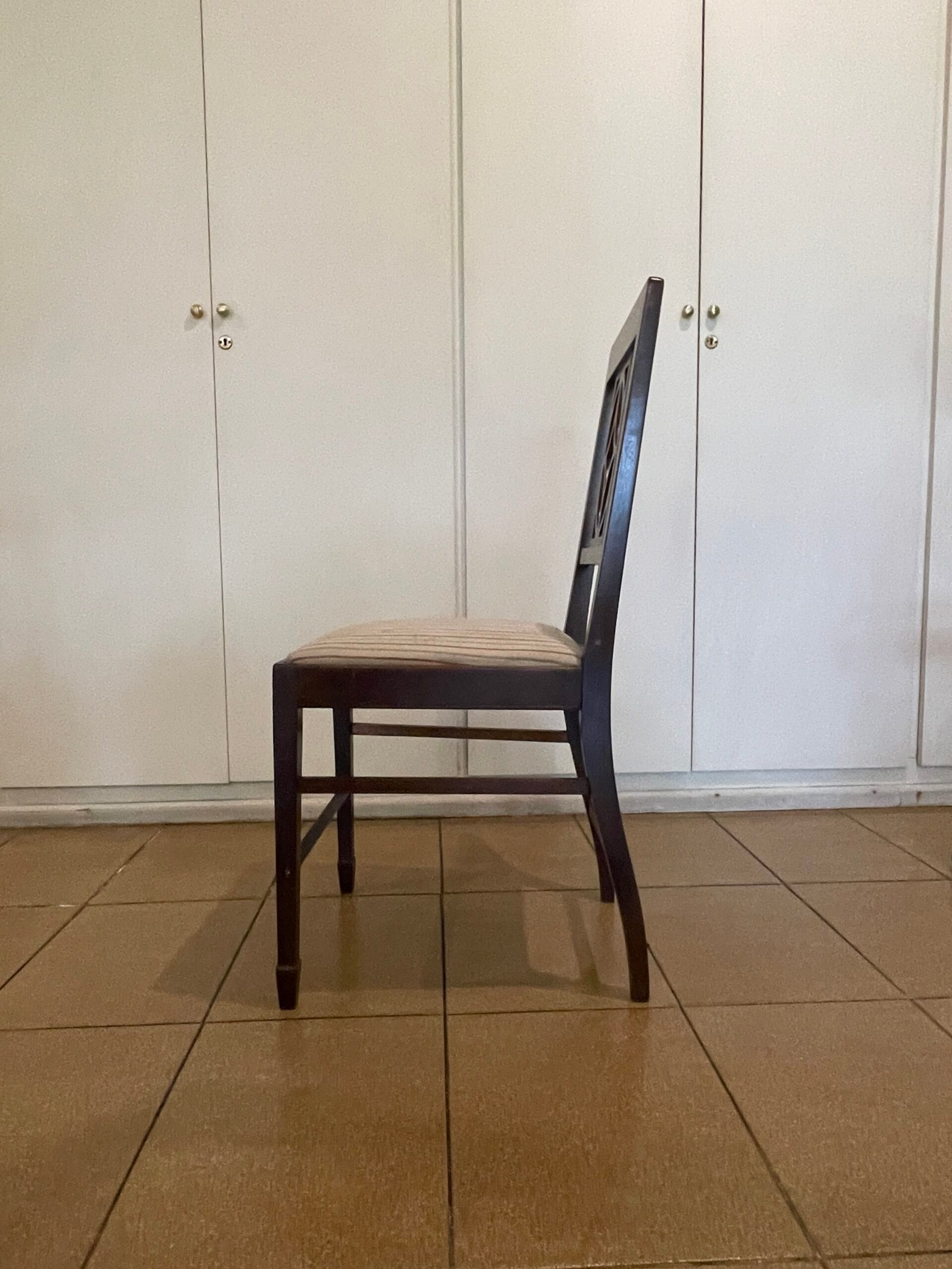 Cód: igrosp03 DESCRIÇÃO: 06 Cadeiras Sem braço Estrutura: madeira maciça Tecido: jacquard Cor: fundo bege com laranja e verde