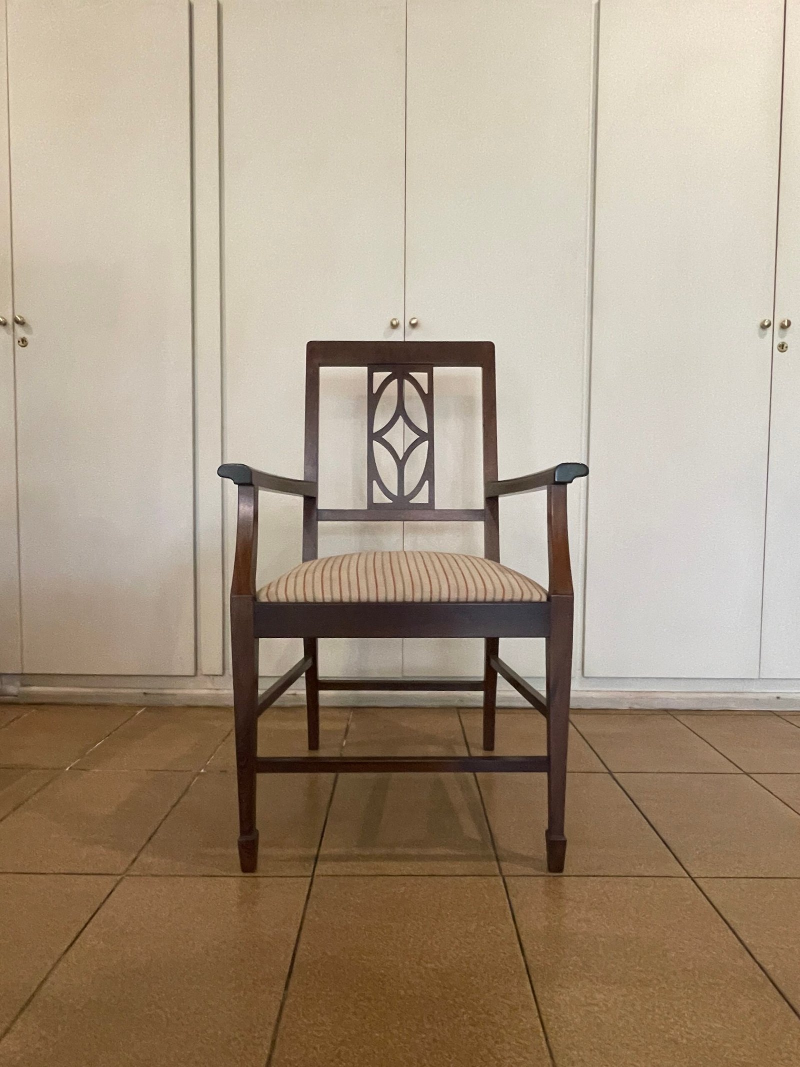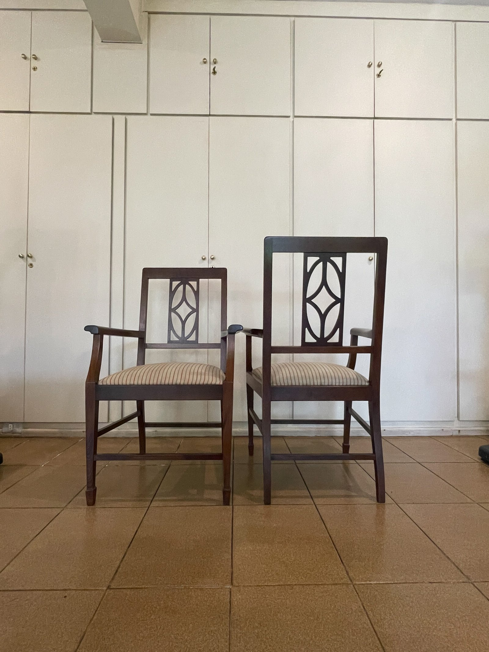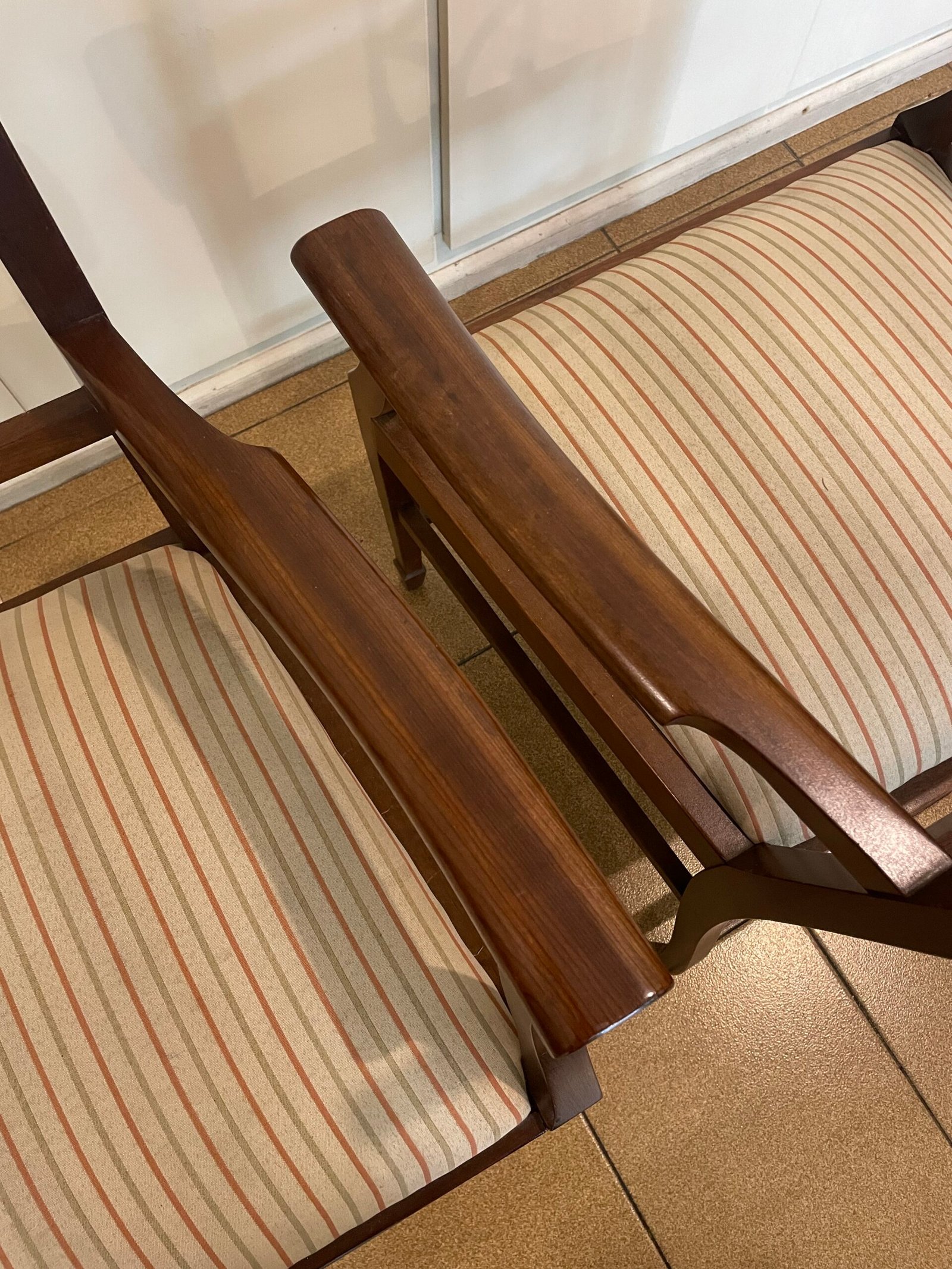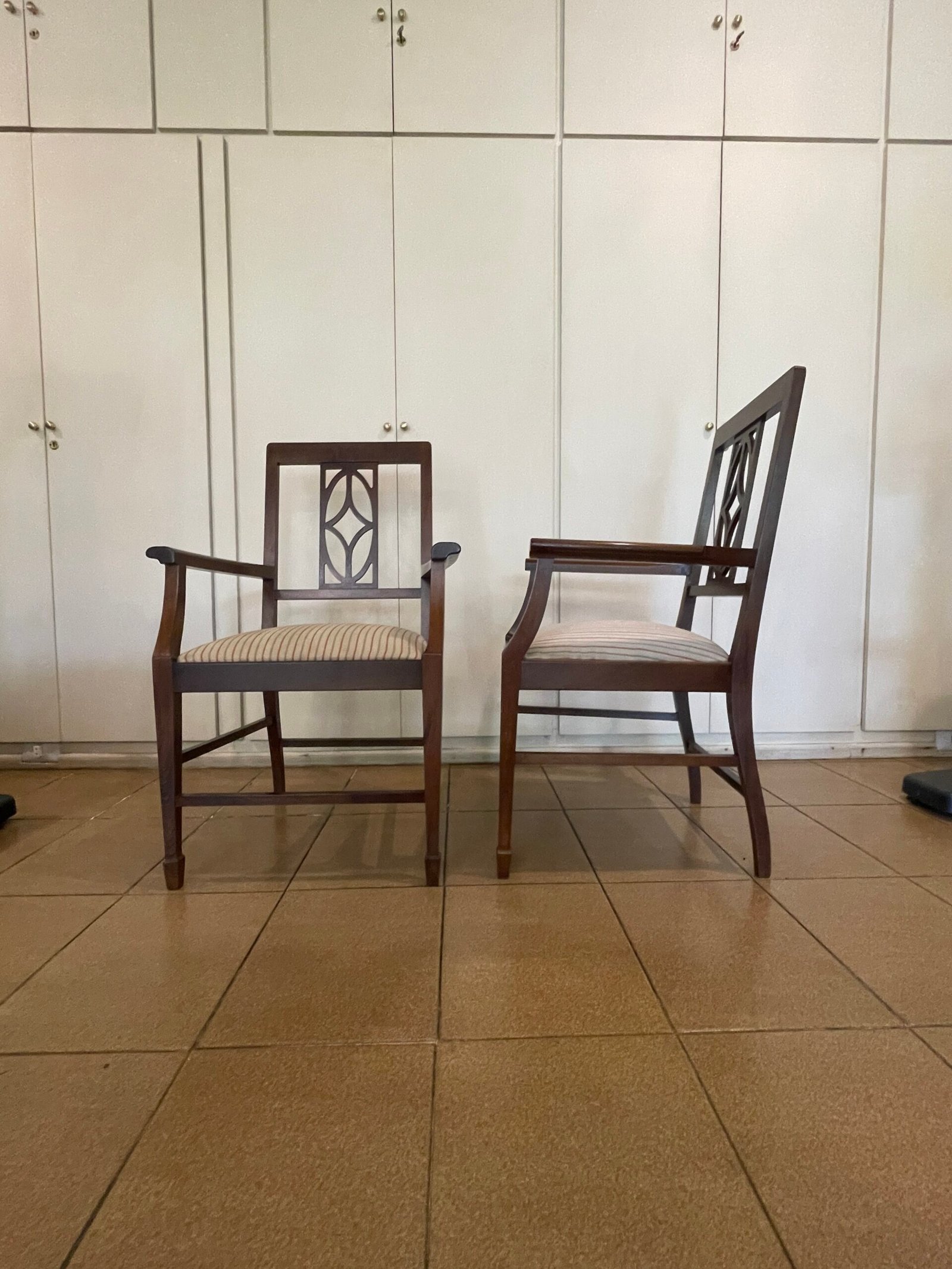 Cód: igrosp02 DESCRIÇÃO: 02 Cadeiras Com braço Estrutura: madeira maciça Tecido: jacquard Cor: fundo bege com laranja e verde