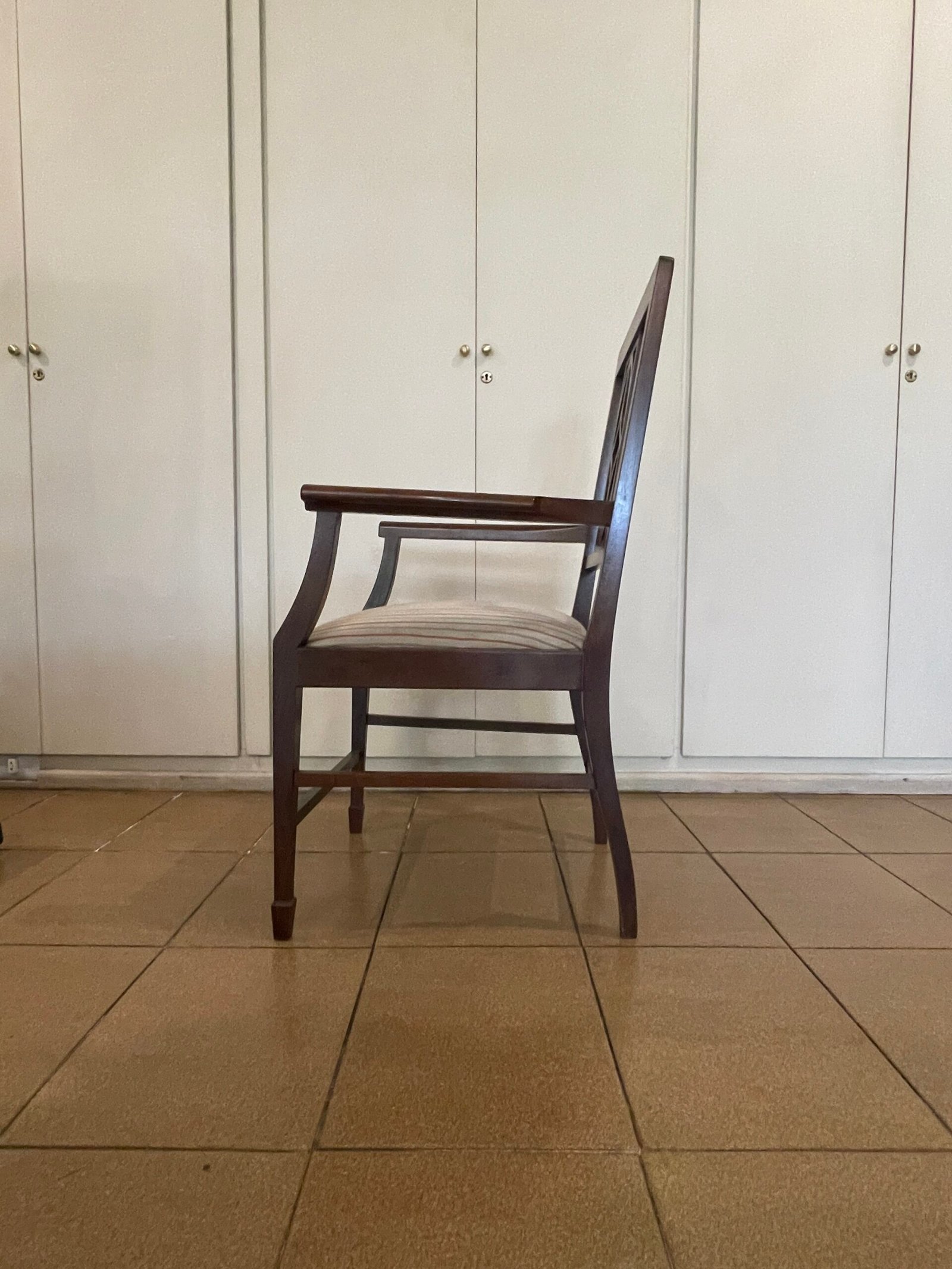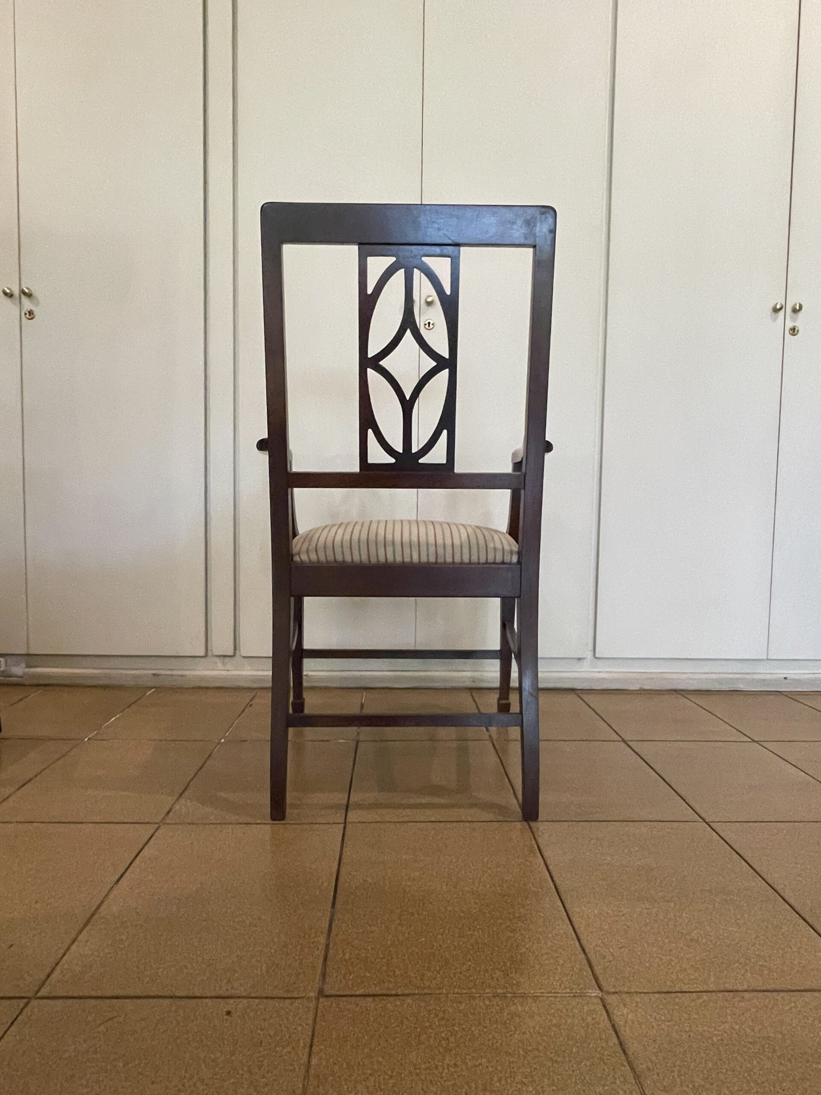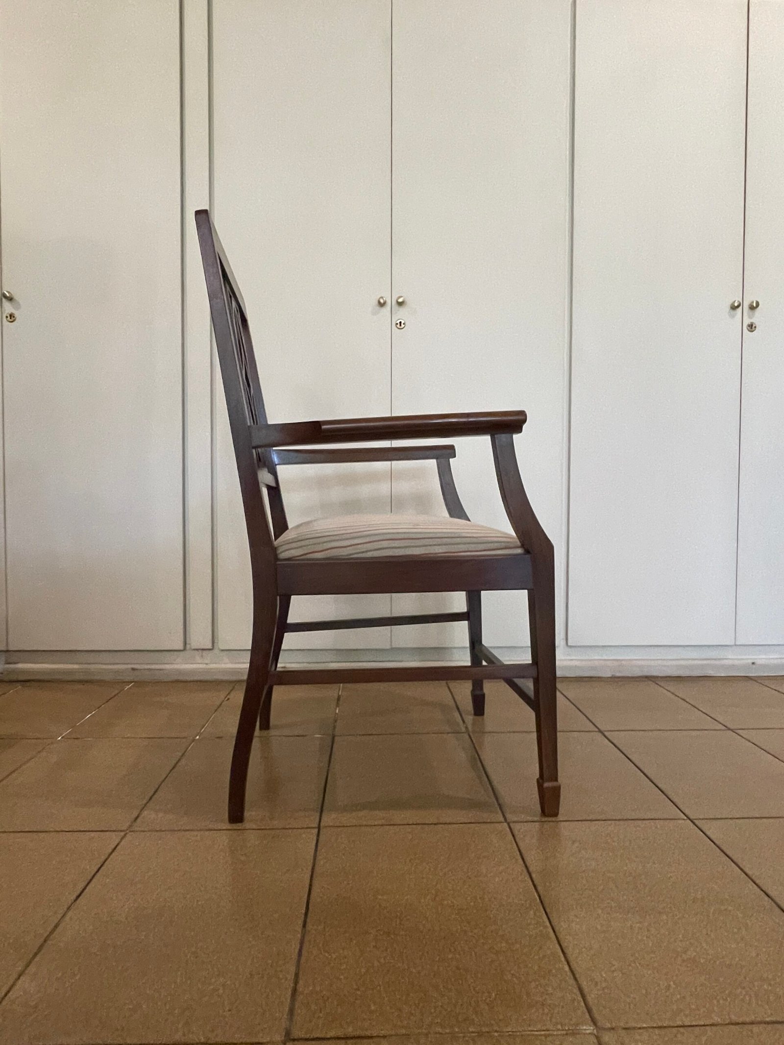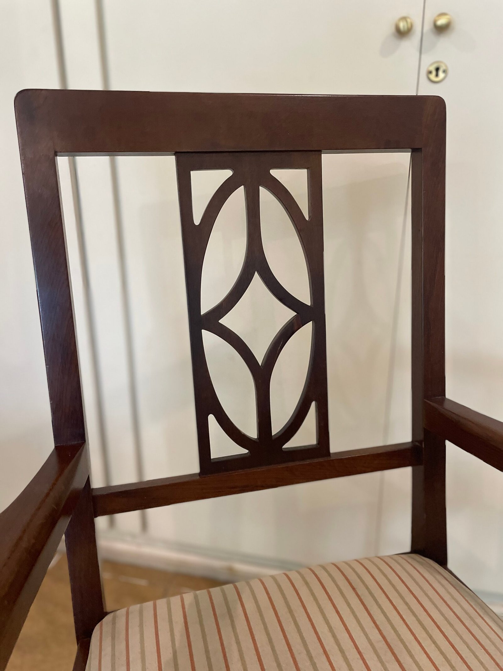 Cód: igrosp02 DESCRIÇÃO: 02 Cadeiras Com braço Estrutura: madeira maciça Tecido: jacquard Cor: fundo bege com laranja e verde