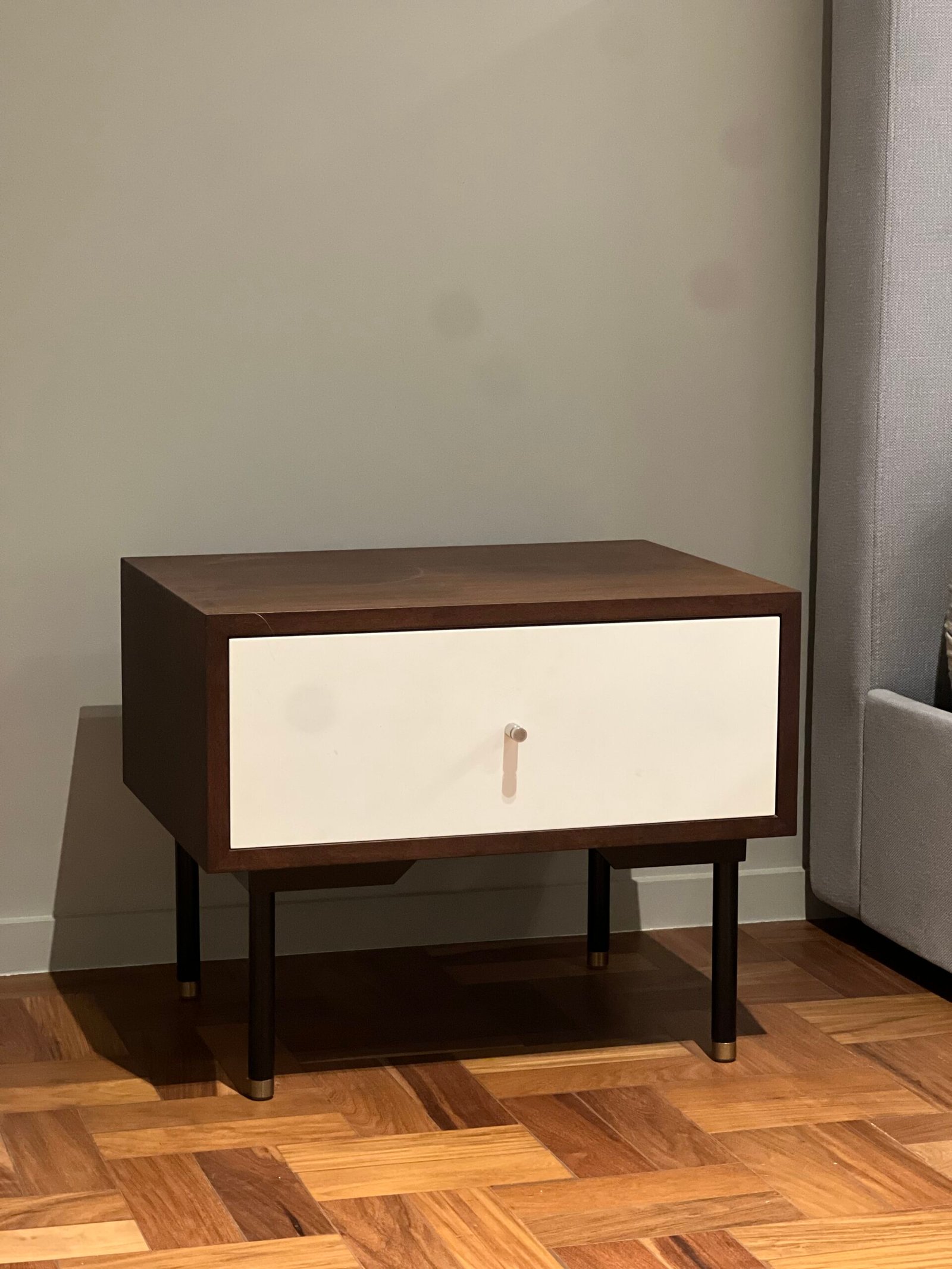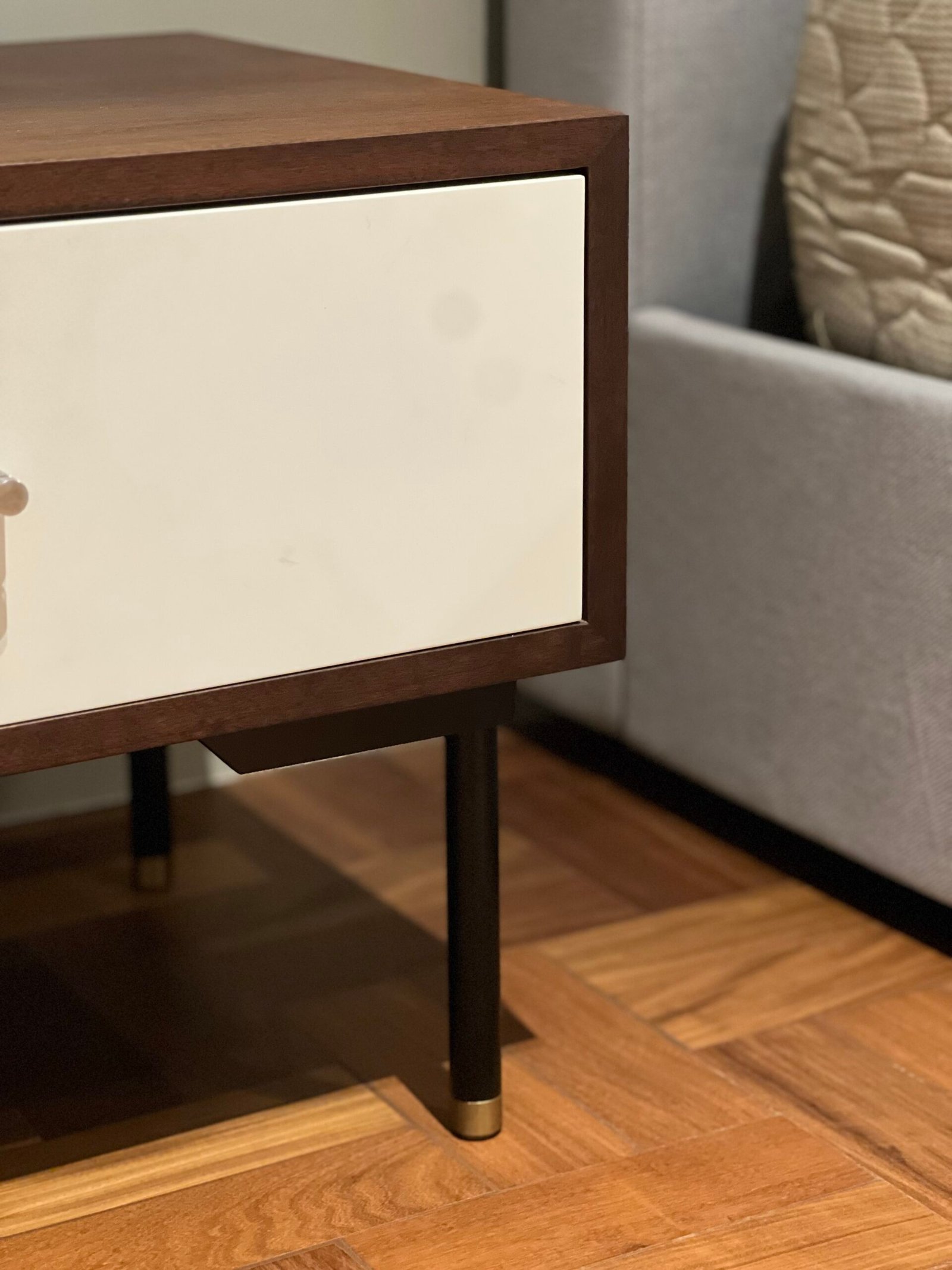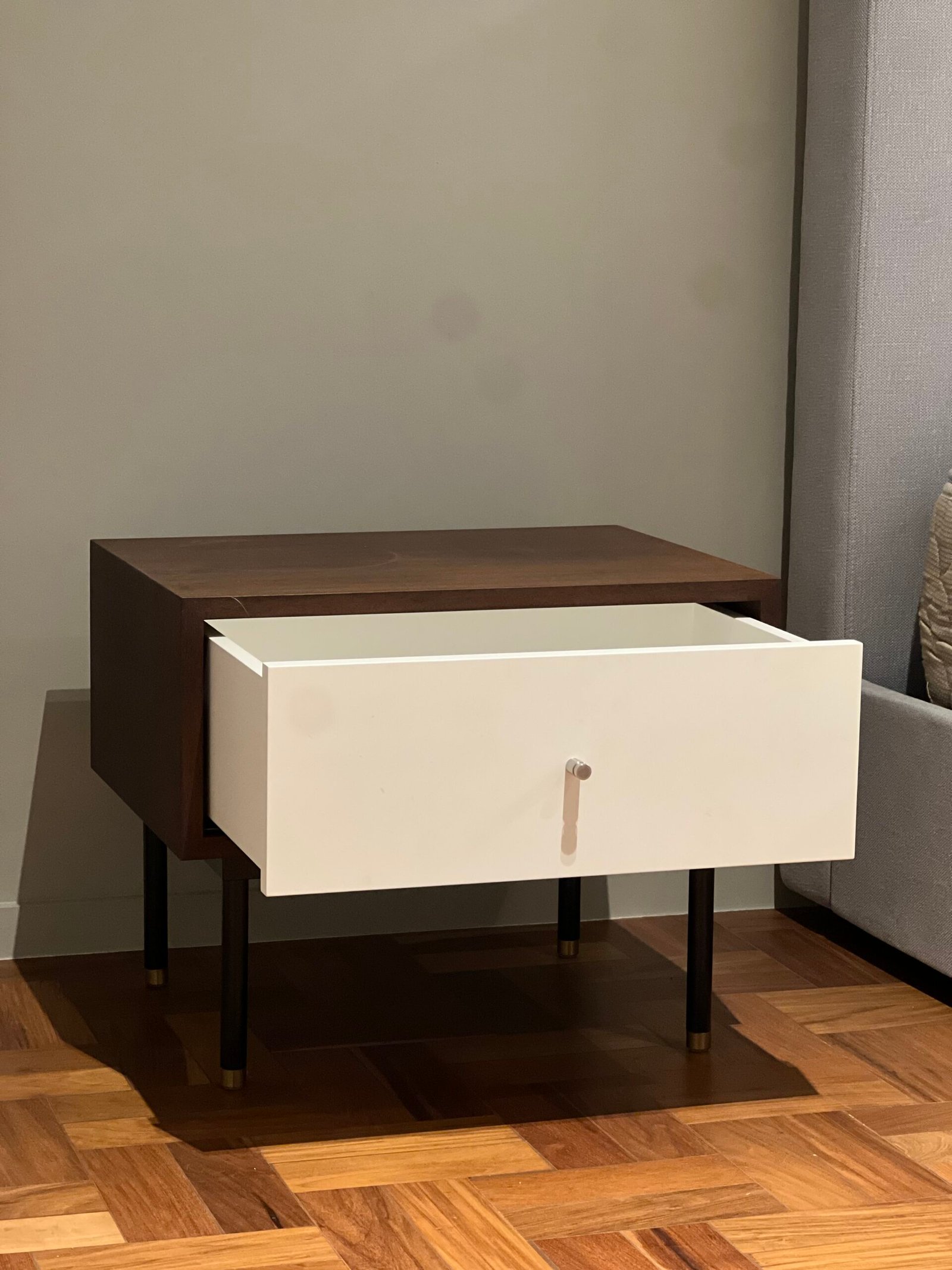 Acabamento: lâmina de madeira pau-ferro e laca branca