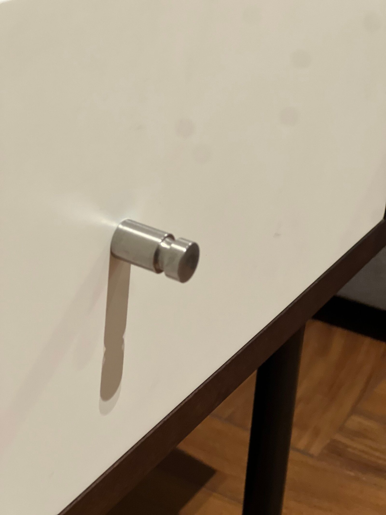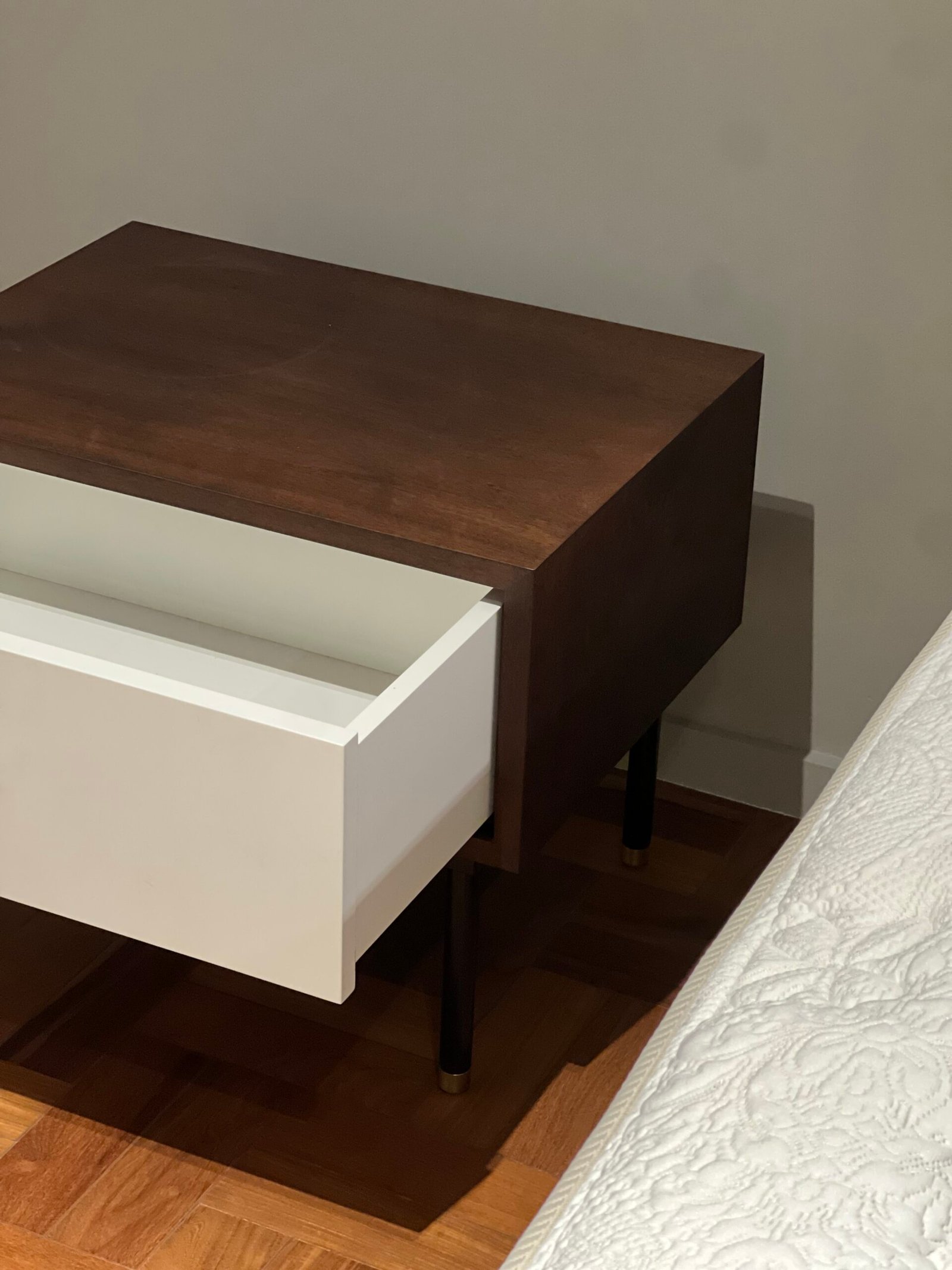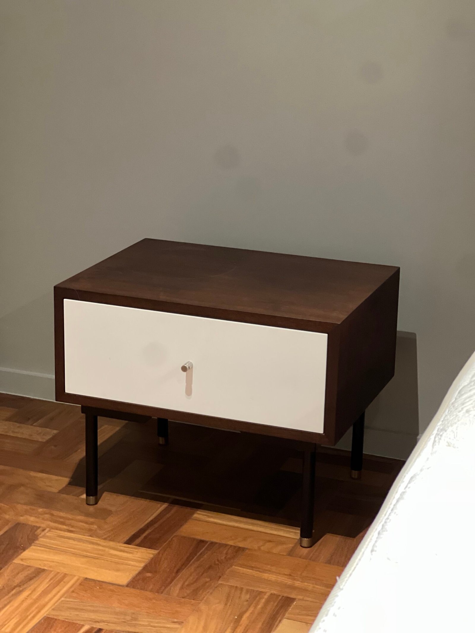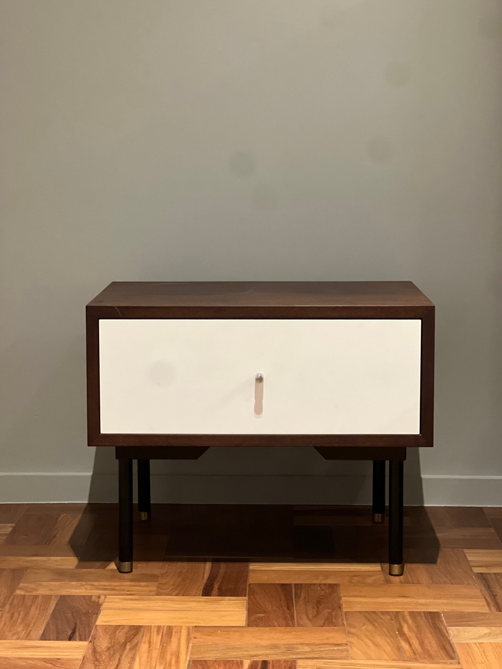 Acabamento: lâmina de madeira pau-ferro e laca branca