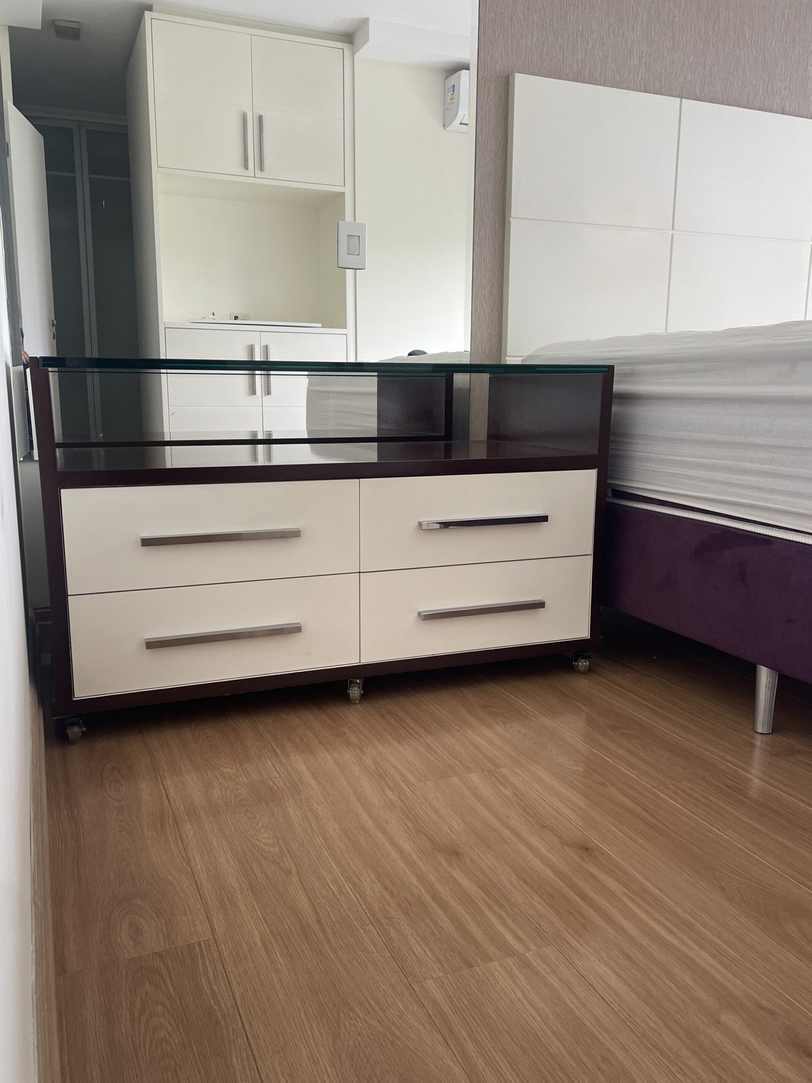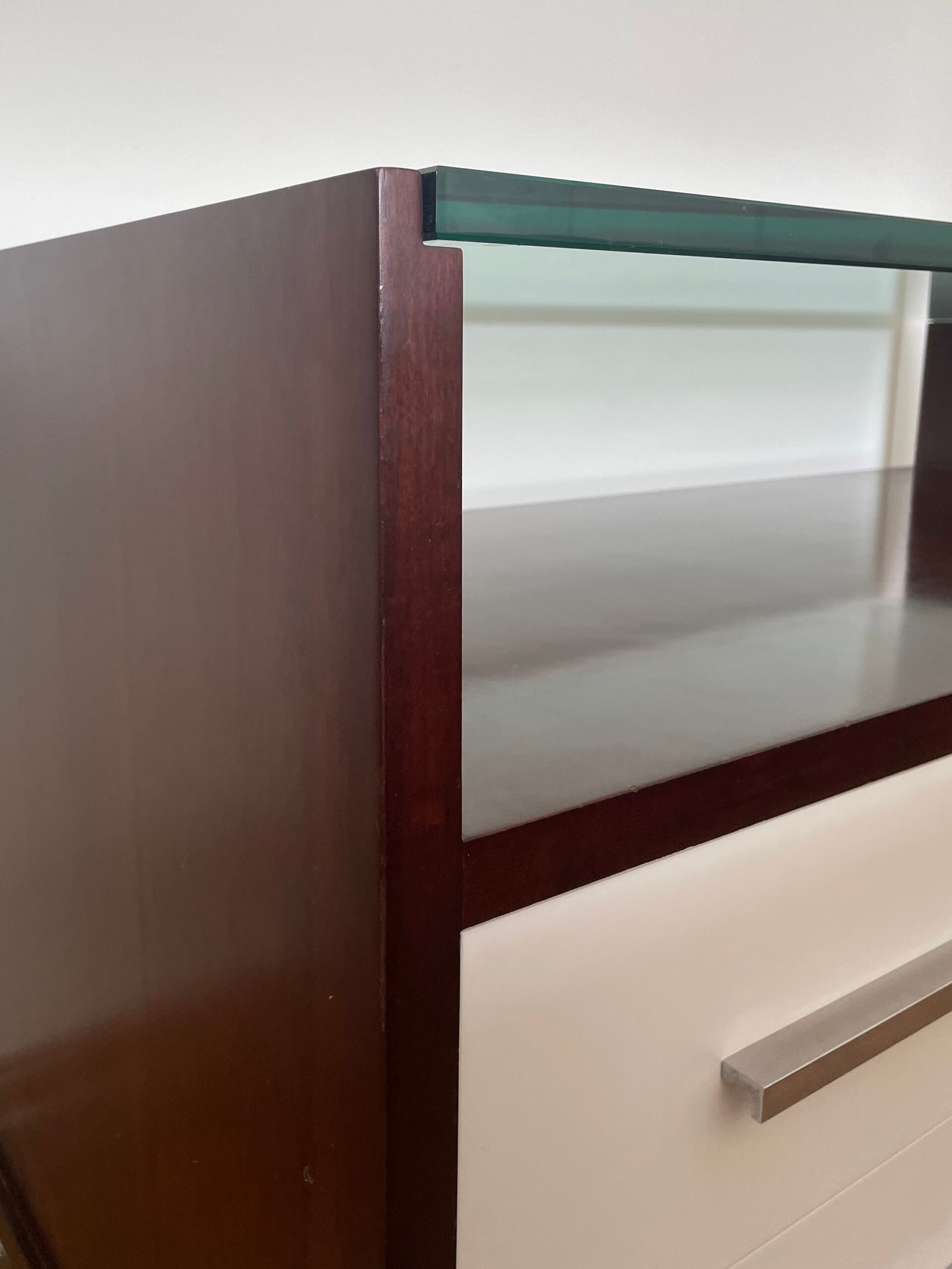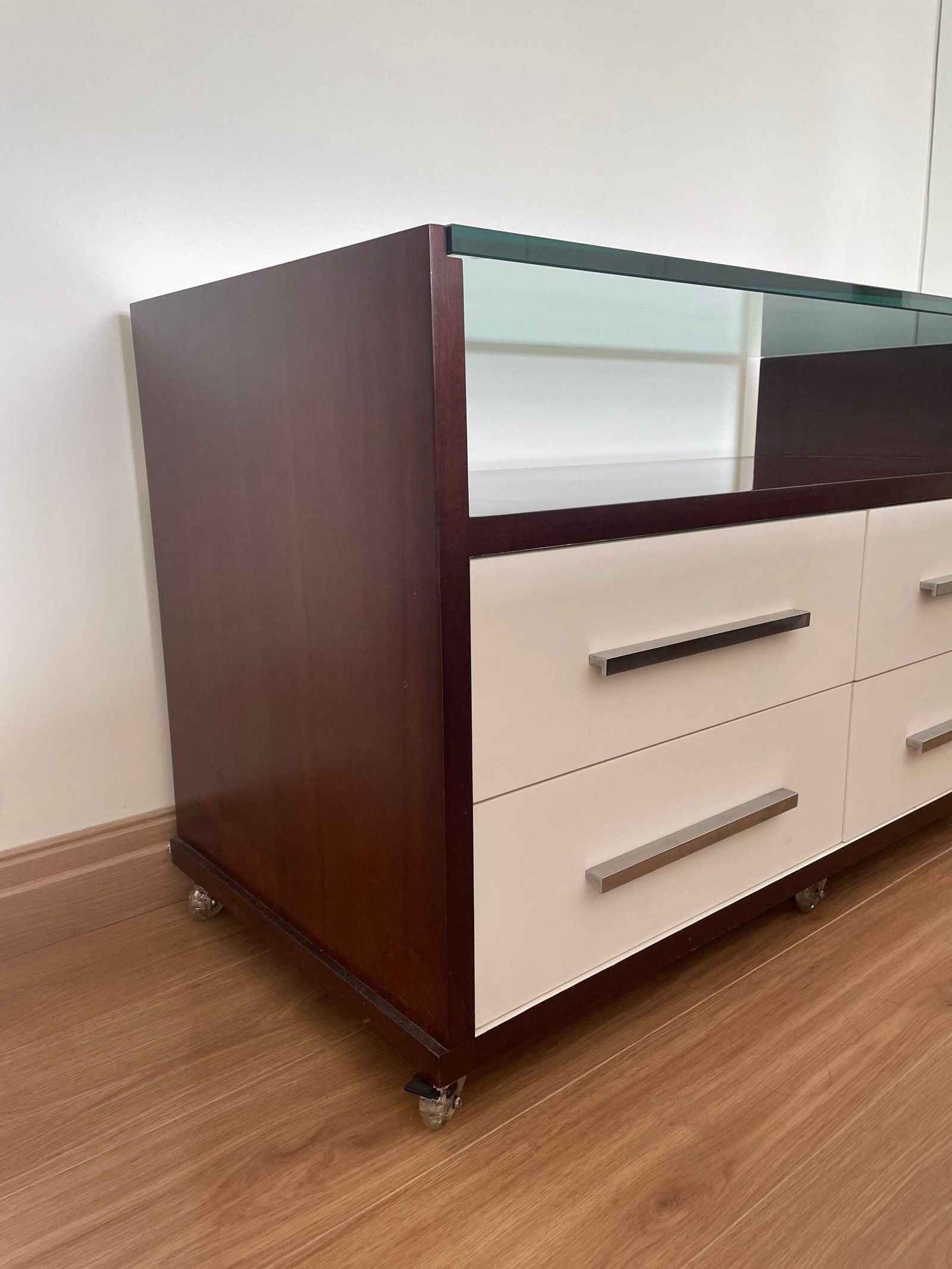 Cód: uratasp08 DESCRIÇÃO: Mesa de cabeceira 04 gavetas, sendo duas com chave Tampo em vidro Pés em rodízio Material: MDF Cor: marrom e branco