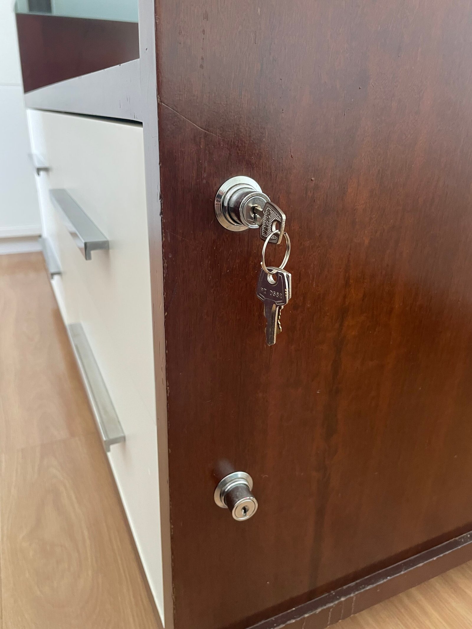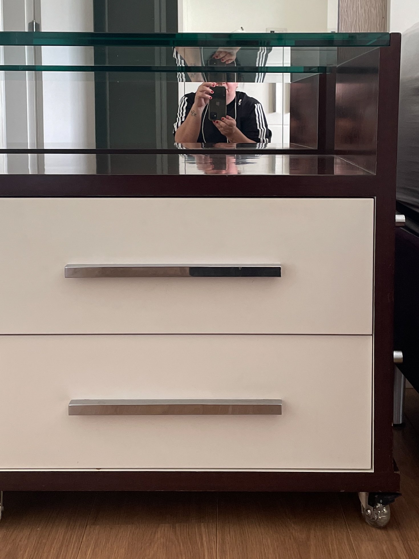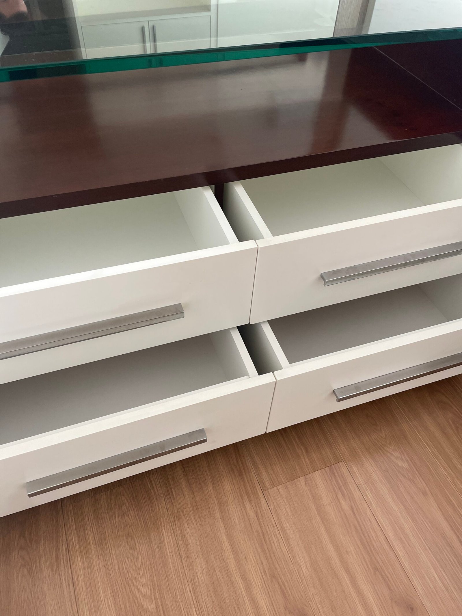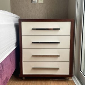 Cód: uratasp08 DESCRIÇÃO: Mesa de cabeceira 04 gavetas, sendo duas com chave Tampo em vidro Pés em rodízio Material: MDF Cor: marrom e branco