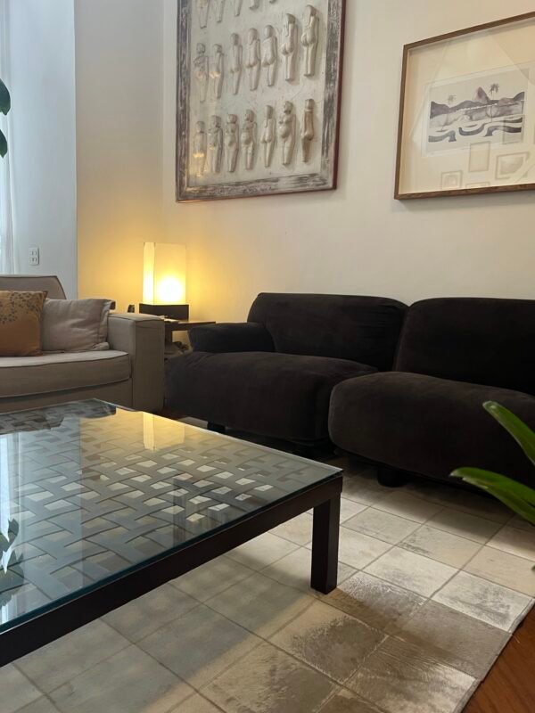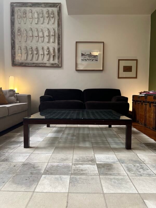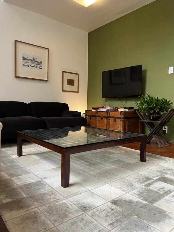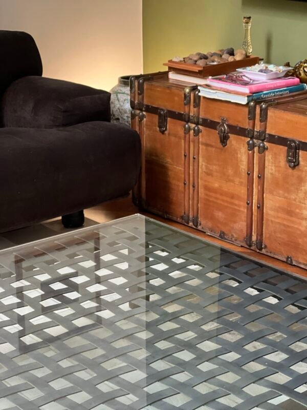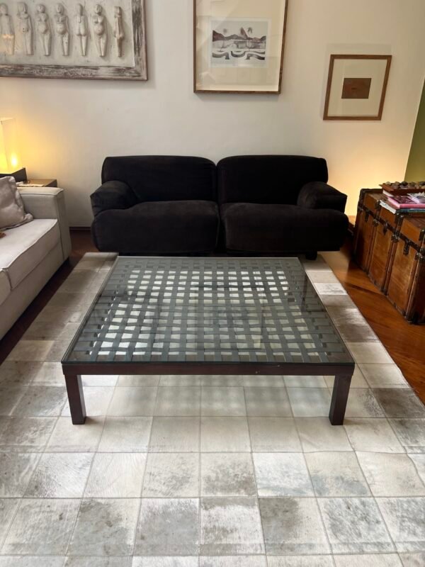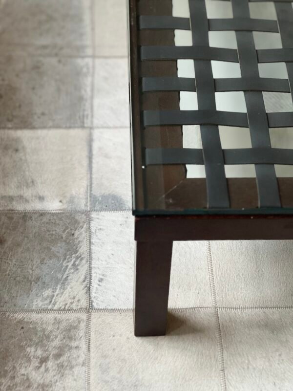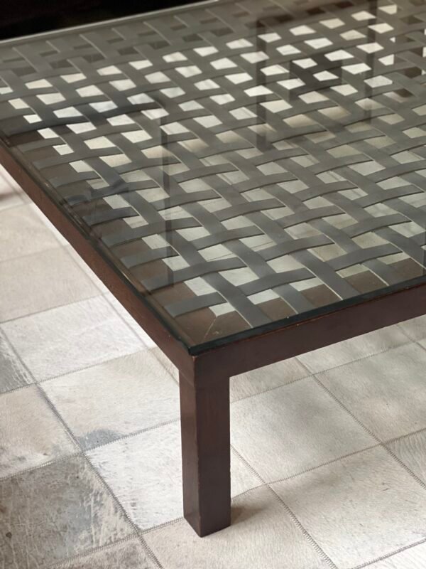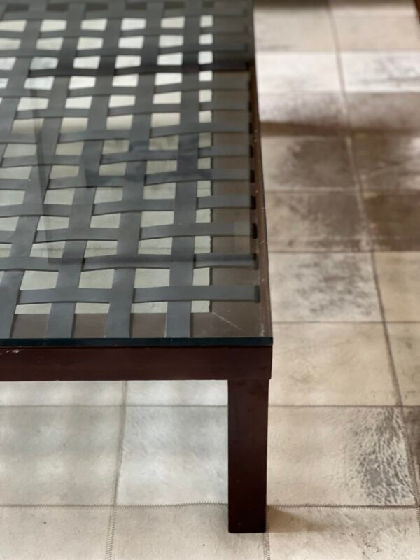 Cód: desarsp03 DESCRIÇÃO: Mesa de centro Designer: Baba Vacaro Trançado em couro Tampo em vidro Estrutura: madeira