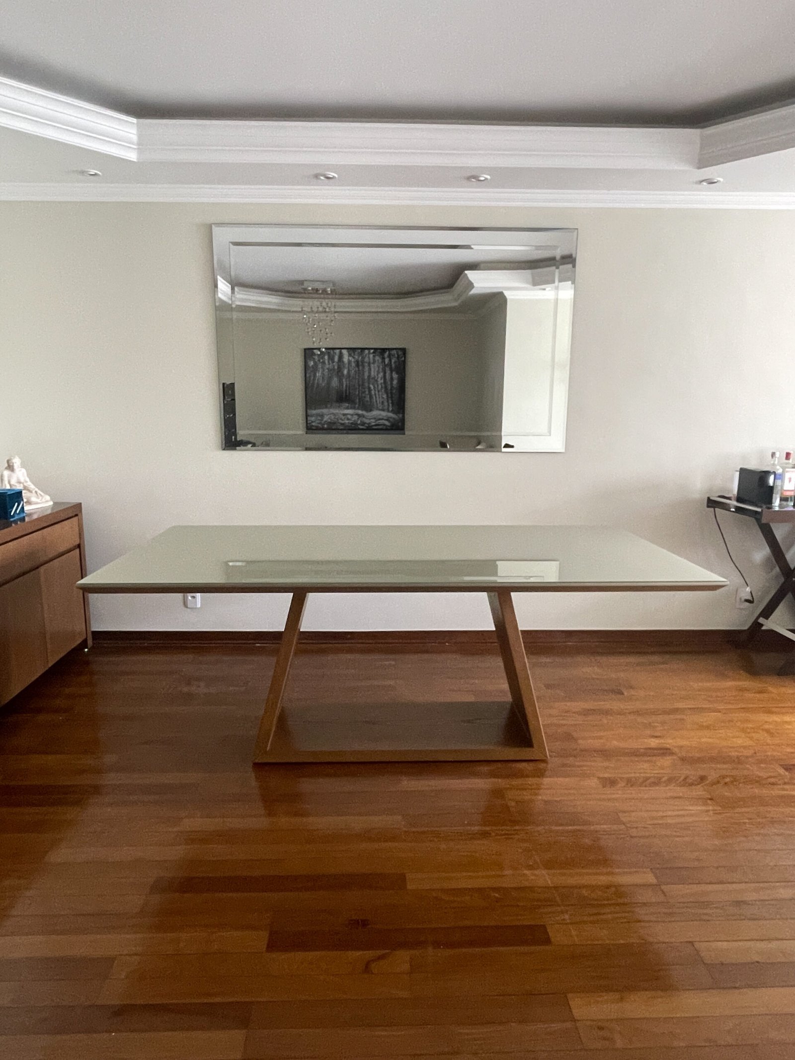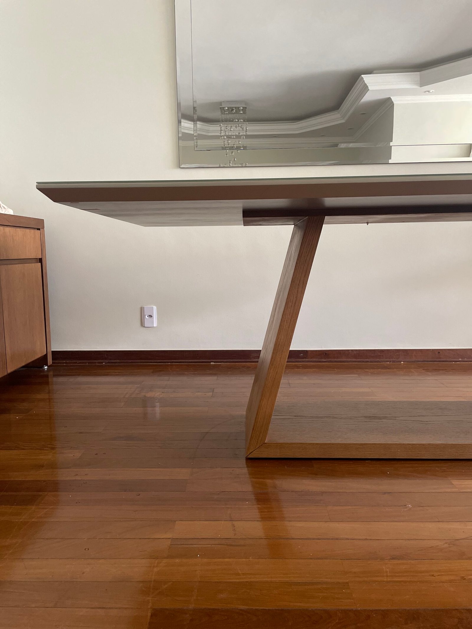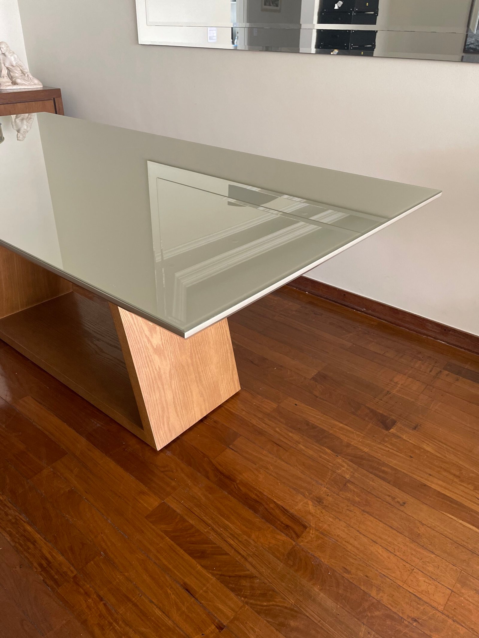 Cód: daalsosp02 DESCRIÇÃO: Mesa de jantar Life Tampo laqueado na cor fendi com vidro leitoso sobreposto Base em madeira laminada