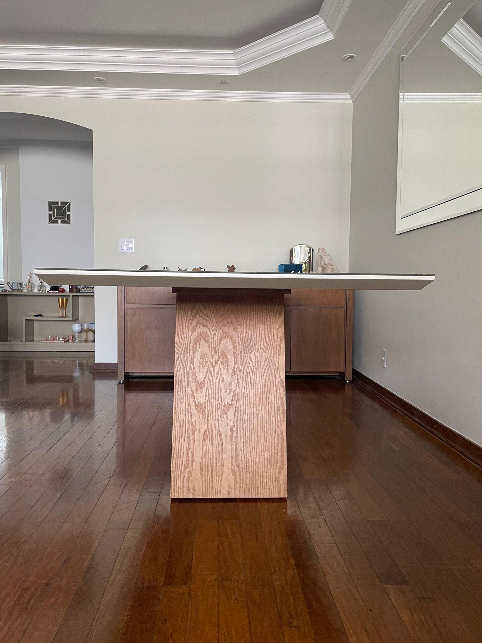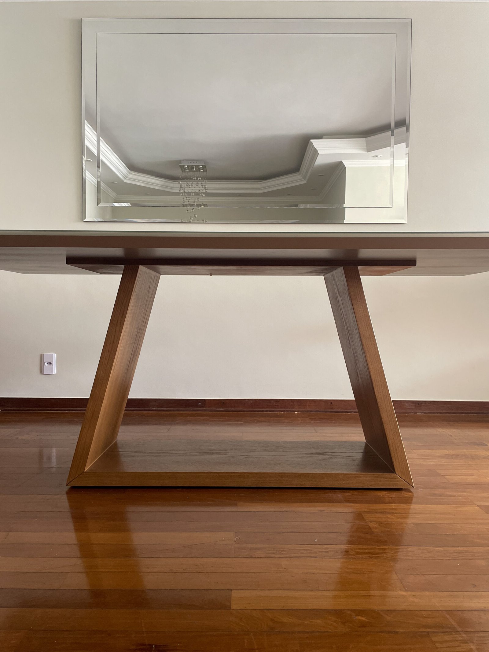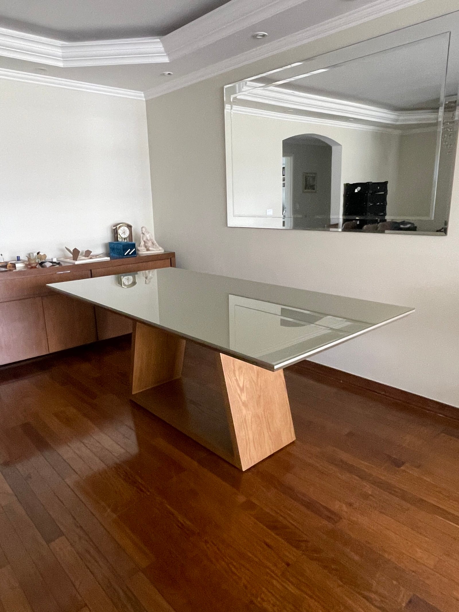 Cód: daalsosp02 DESCRIÇÃO: Mesa de jantar Life Tampo laqueado na cor fendi com vidro leitoso sobreposto Base em madeira laminada