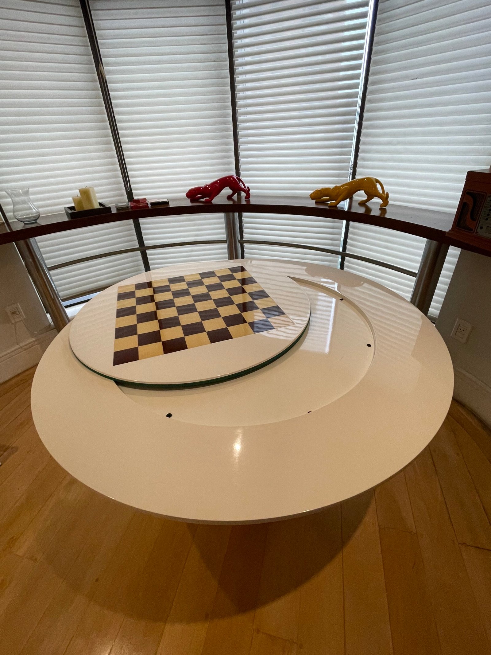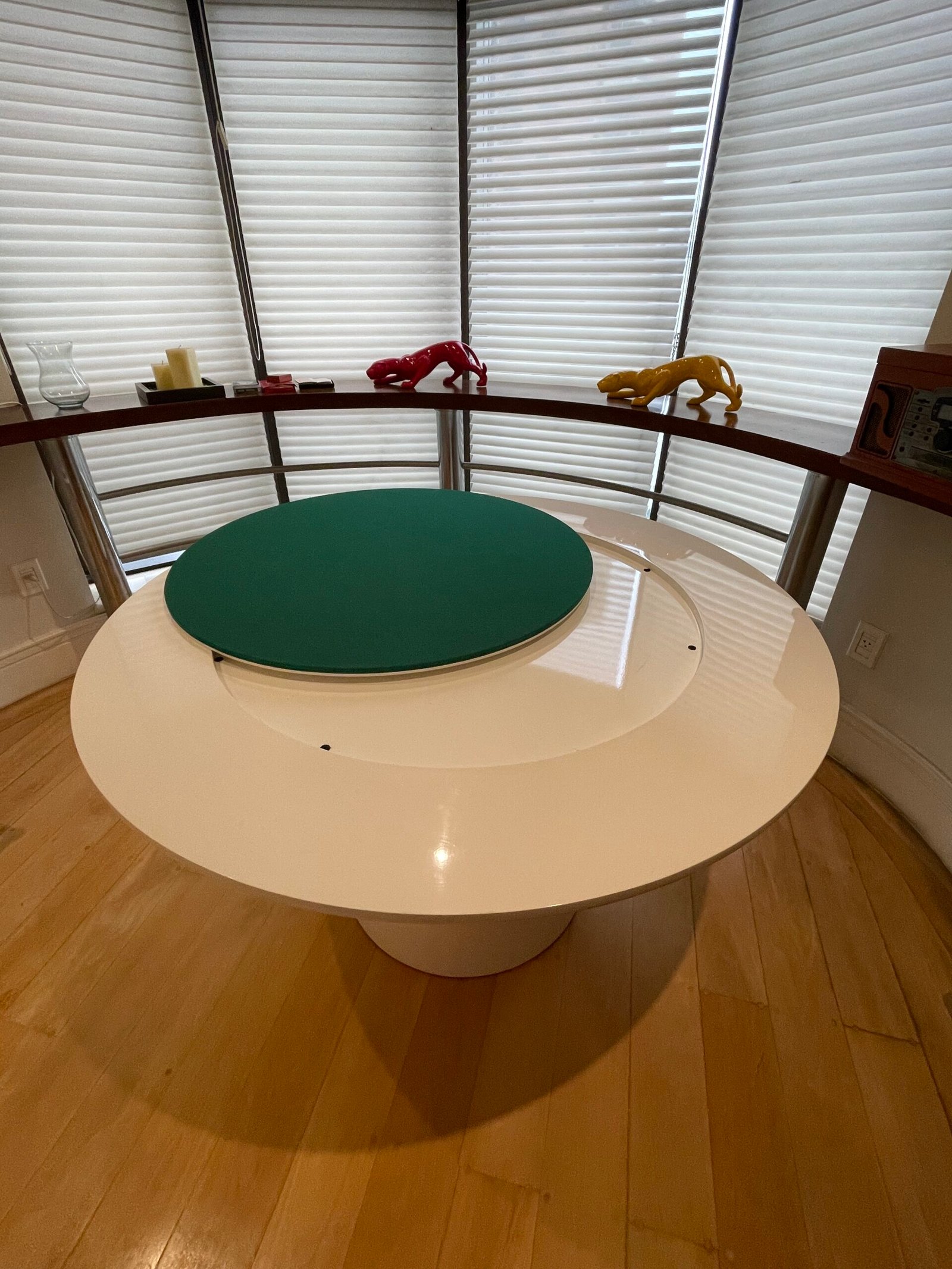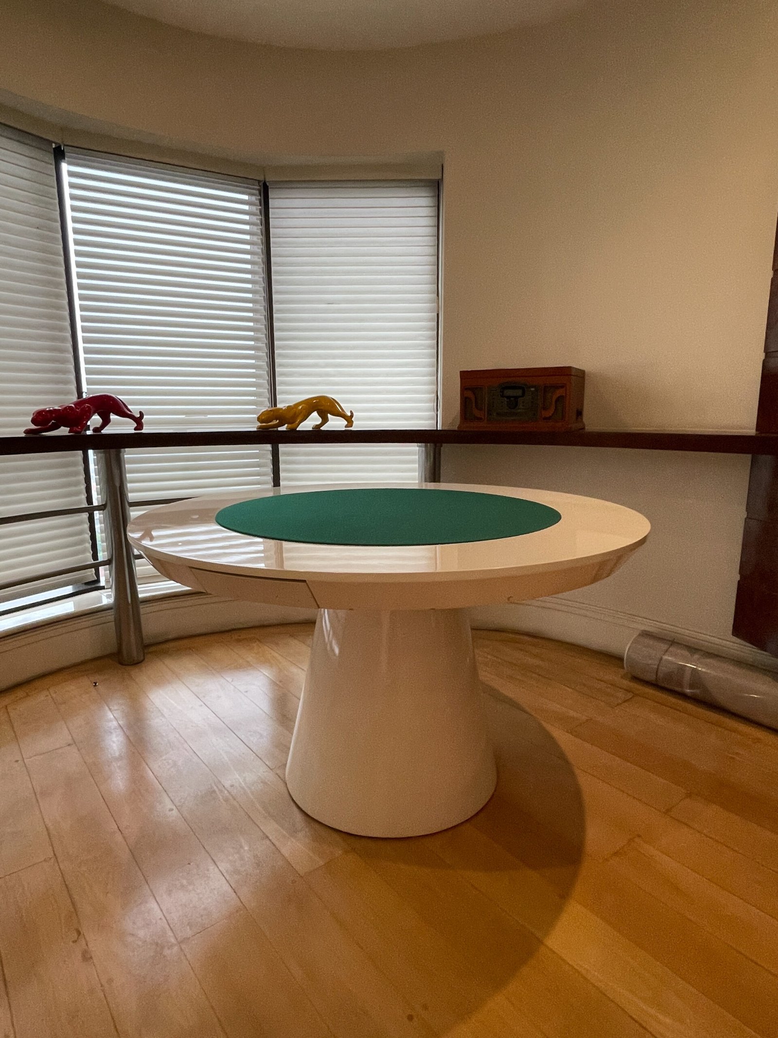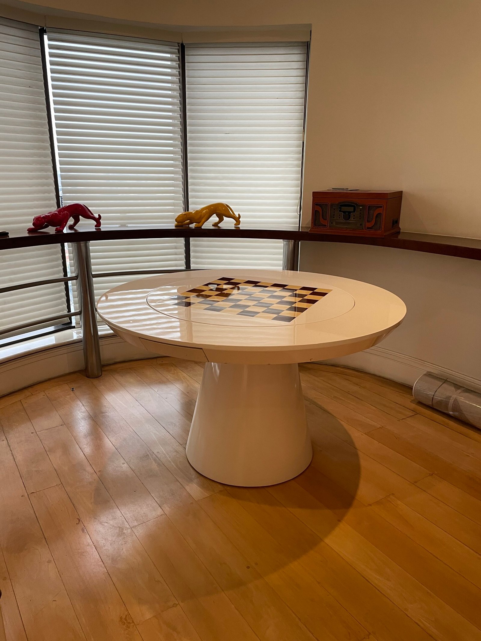 Cód: lharibesp04 DESCRIÇÃO: Mesa de jogos 04 gavetas Tampo com centro em tecido verde e malha de jogo de tabuleiro Acabamento: laca Cor: branco