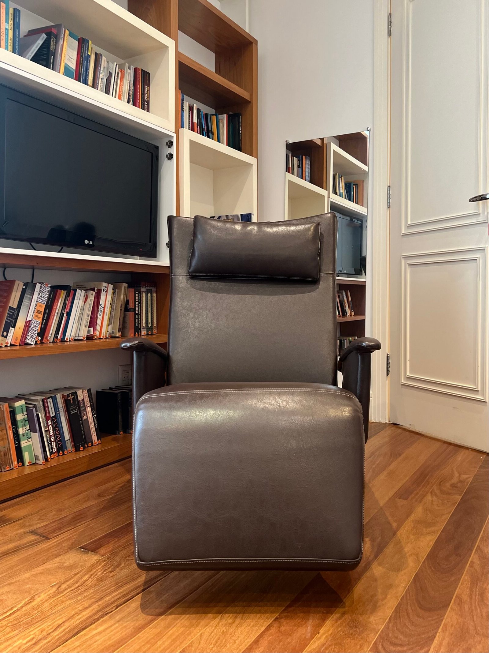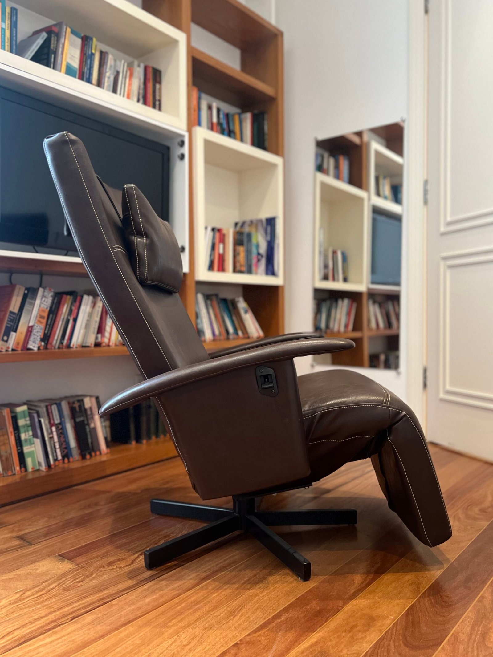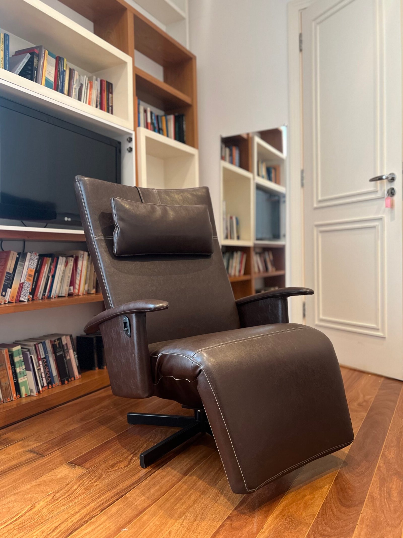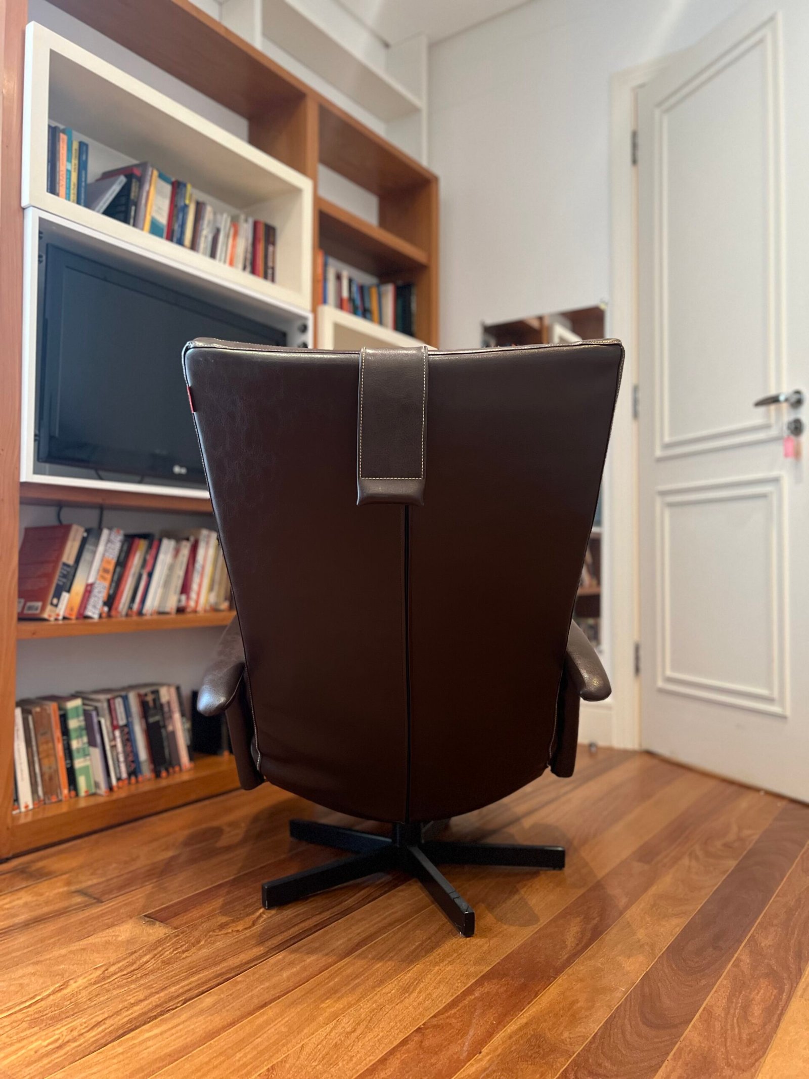 Cód: chelsansp03 DESCRIÇÃO: Poltrona reclinável Giratória Pés em metal Tecido: couro sintético Cor: marrom