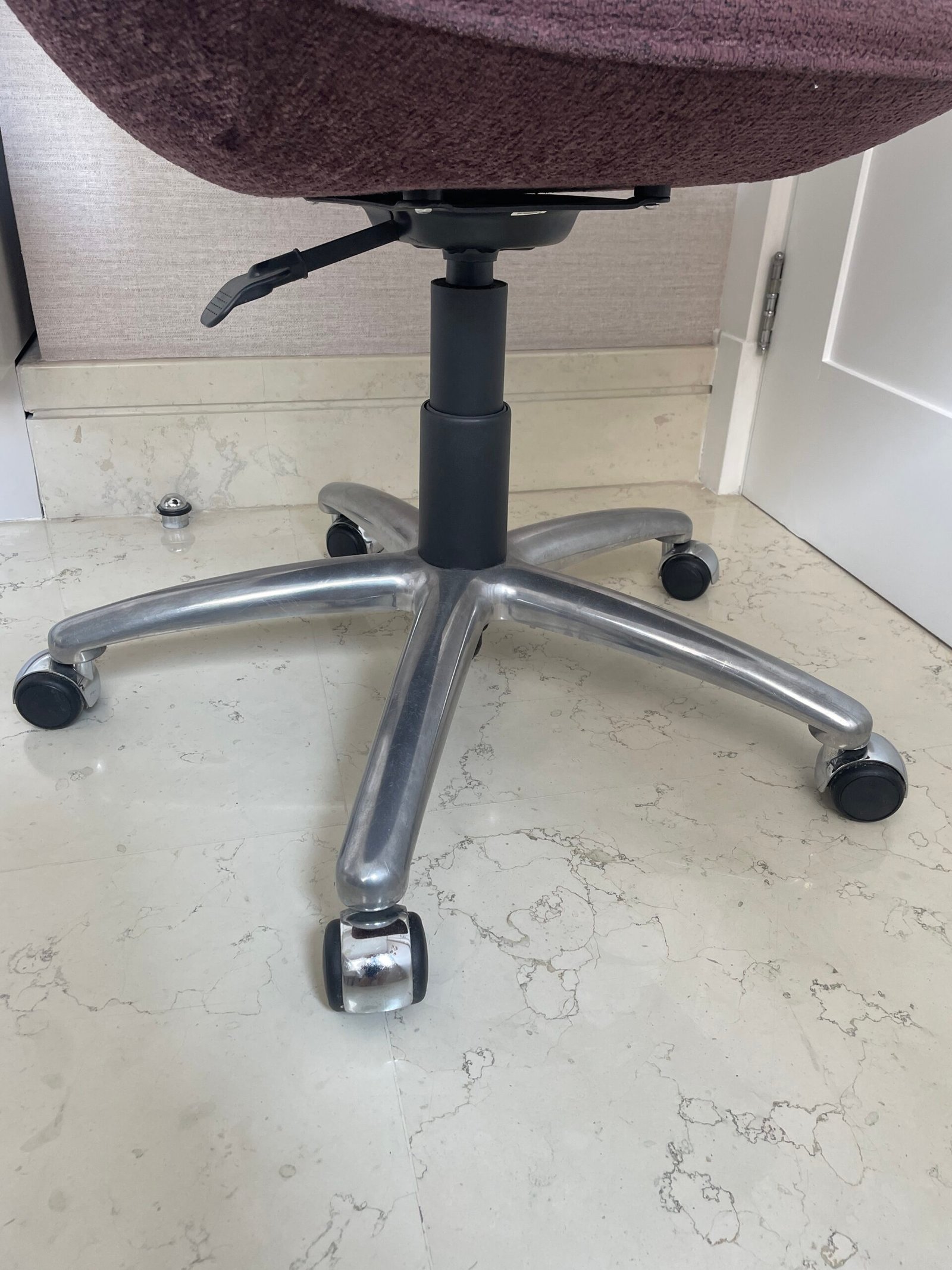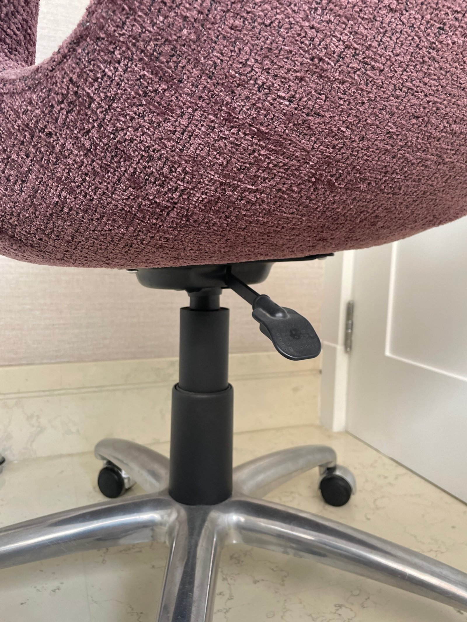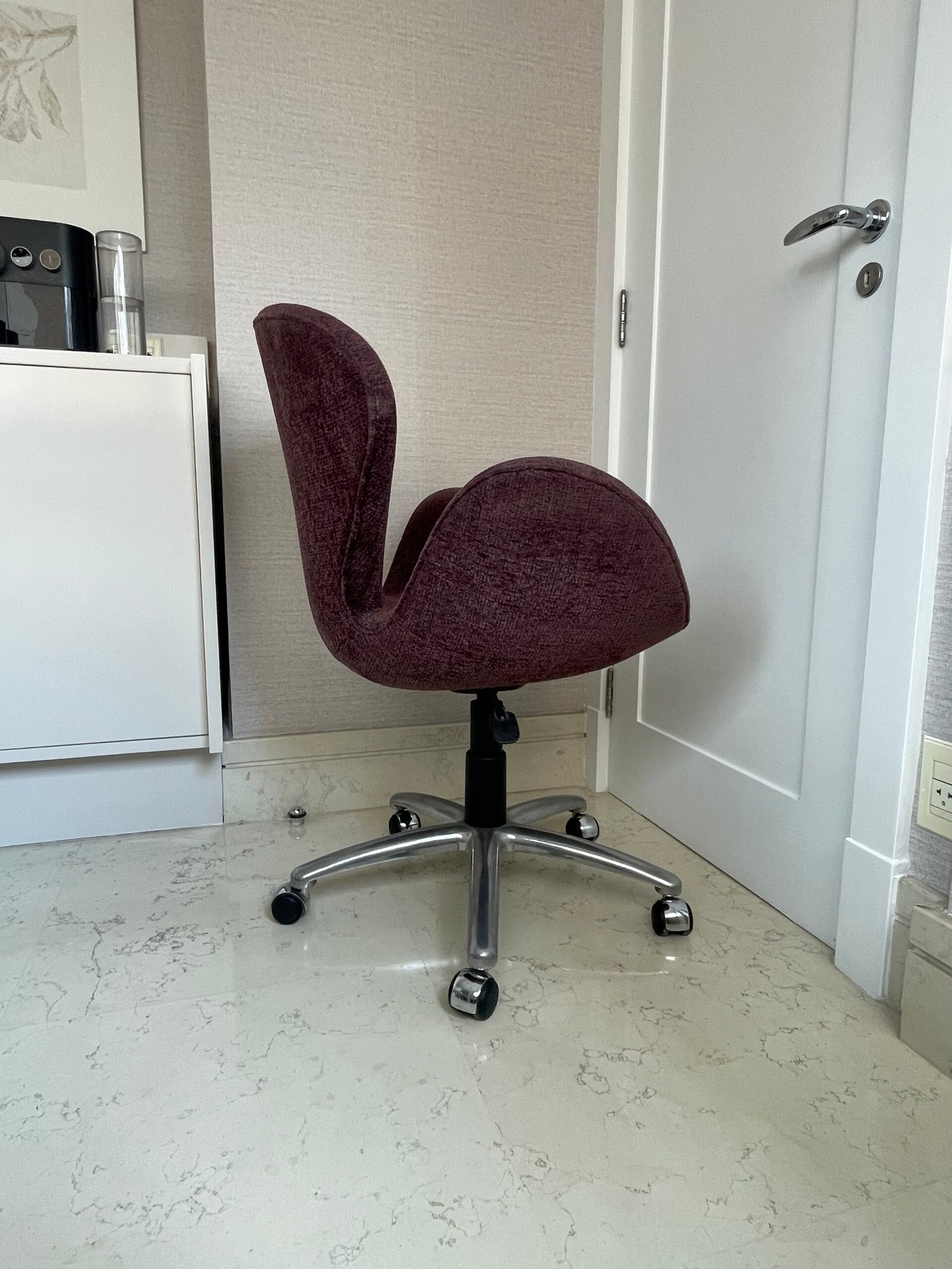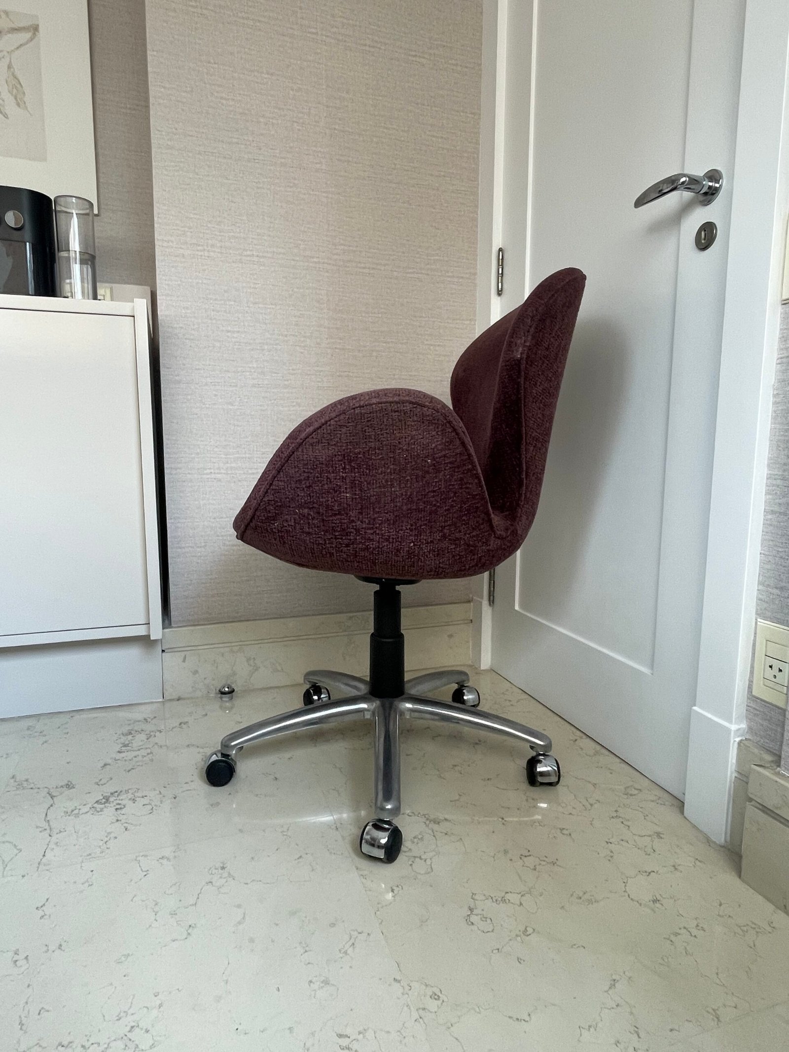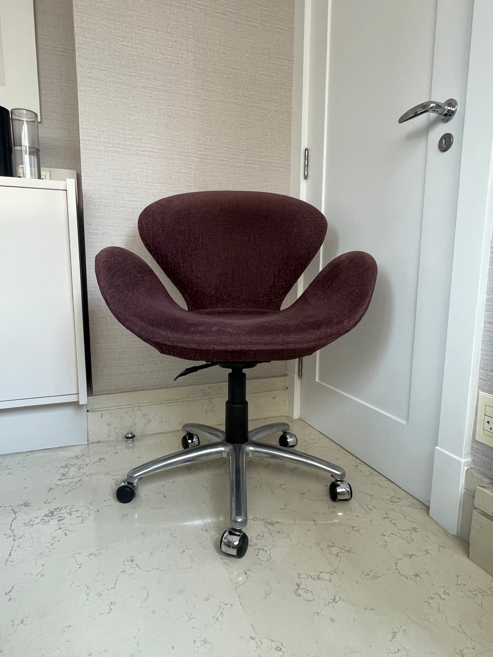 Cód: itubasp01 DESCRIÇÃO: Poltrona Swan Giratória Com regulagem de altura Pés em rodízio e base em alumínio Tecido: chenille | regatta Cor: beterraba