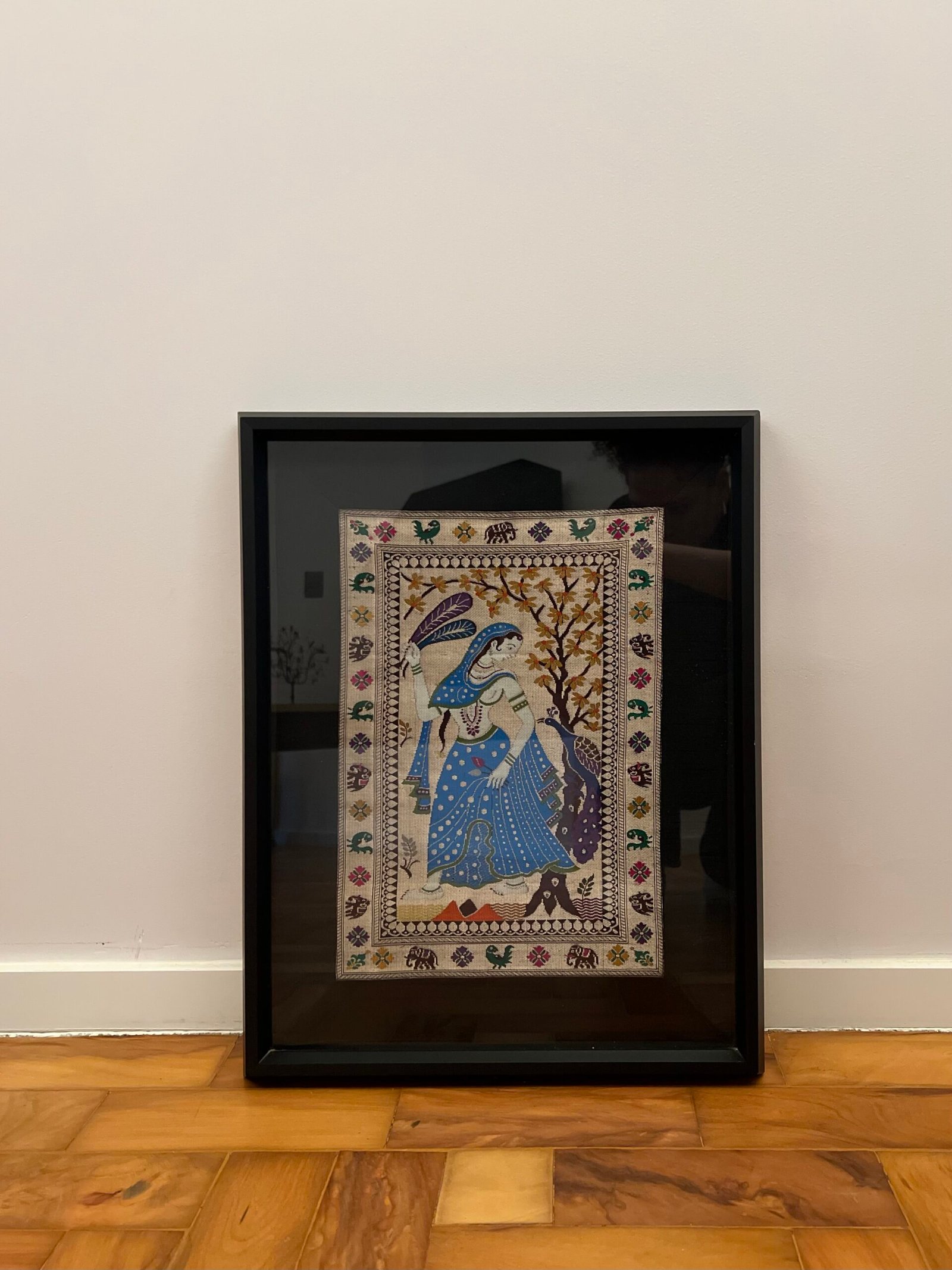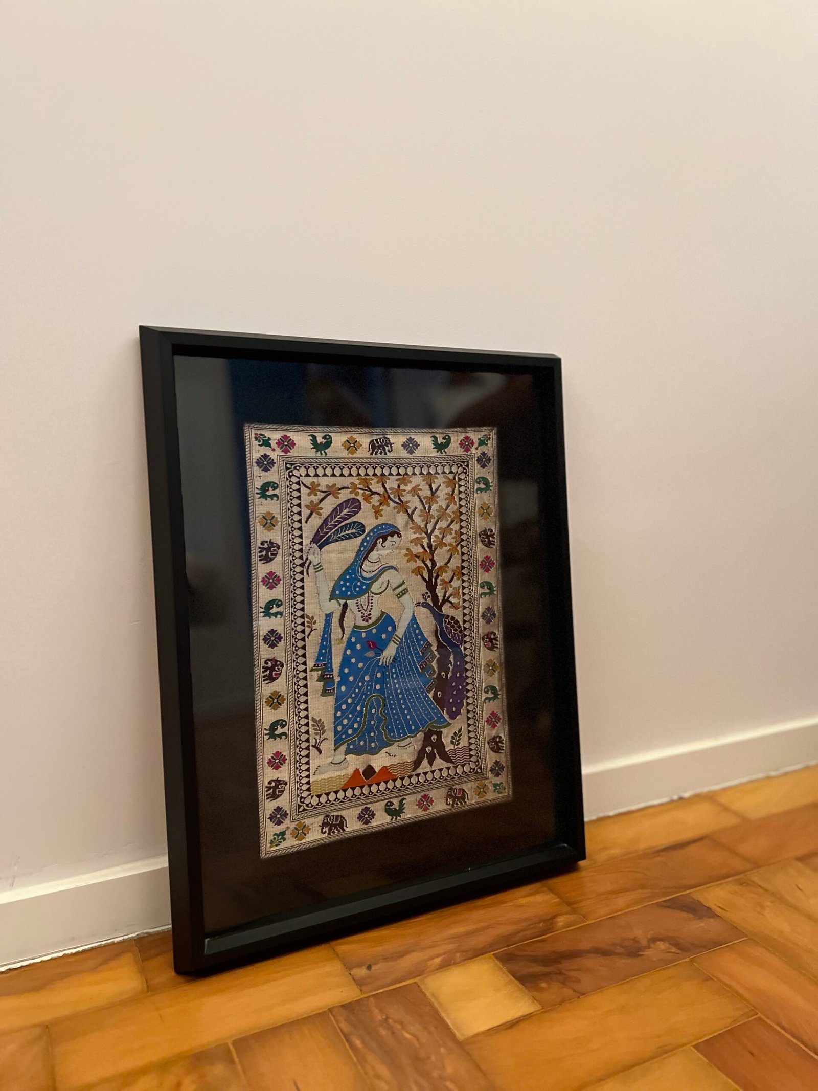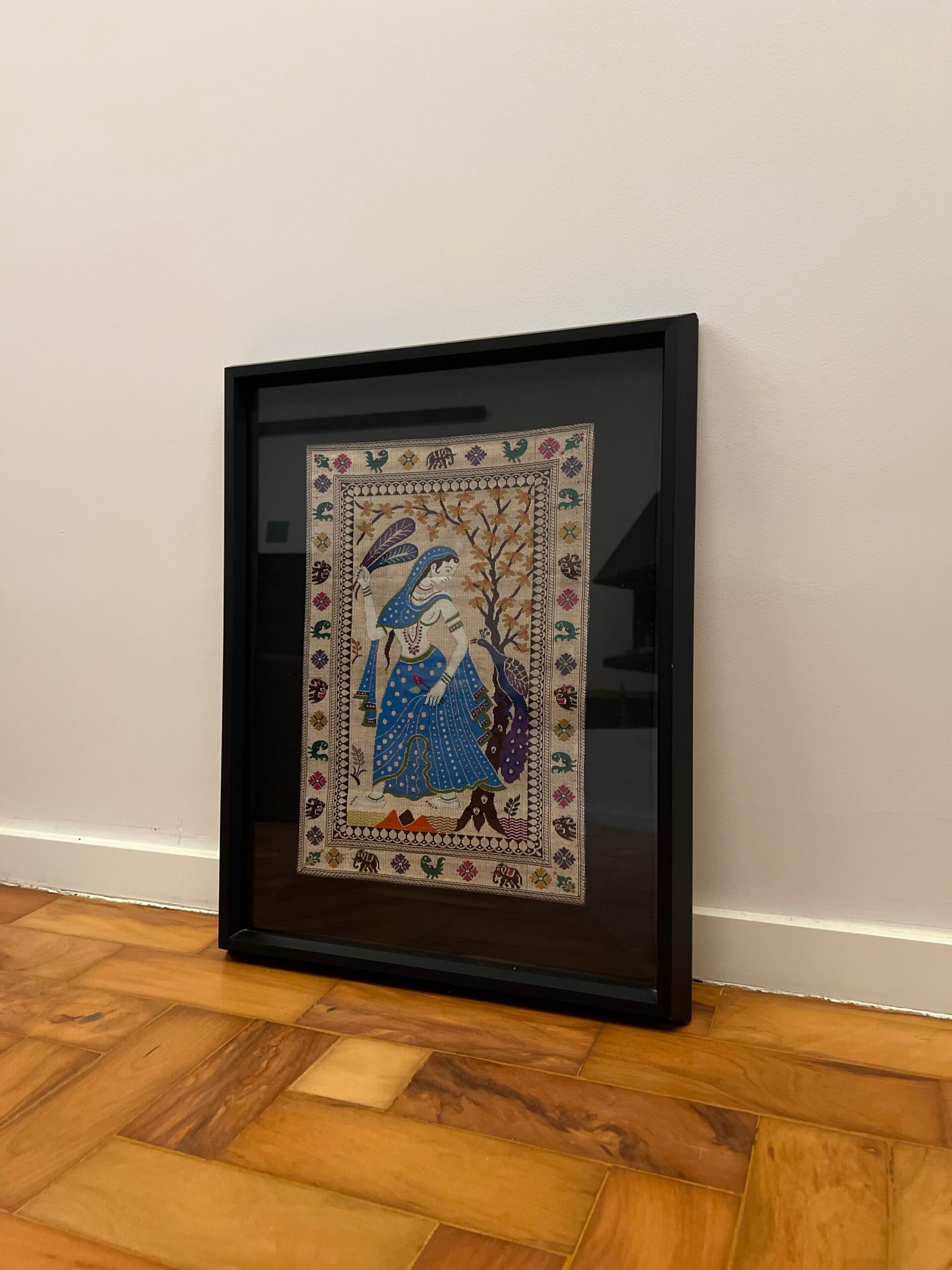 Cód: ropacasp09 DESCRIÇÃO: Quadro Origem: Indía Material / técnica: bordado em seda indiana Moldura: madeira preta