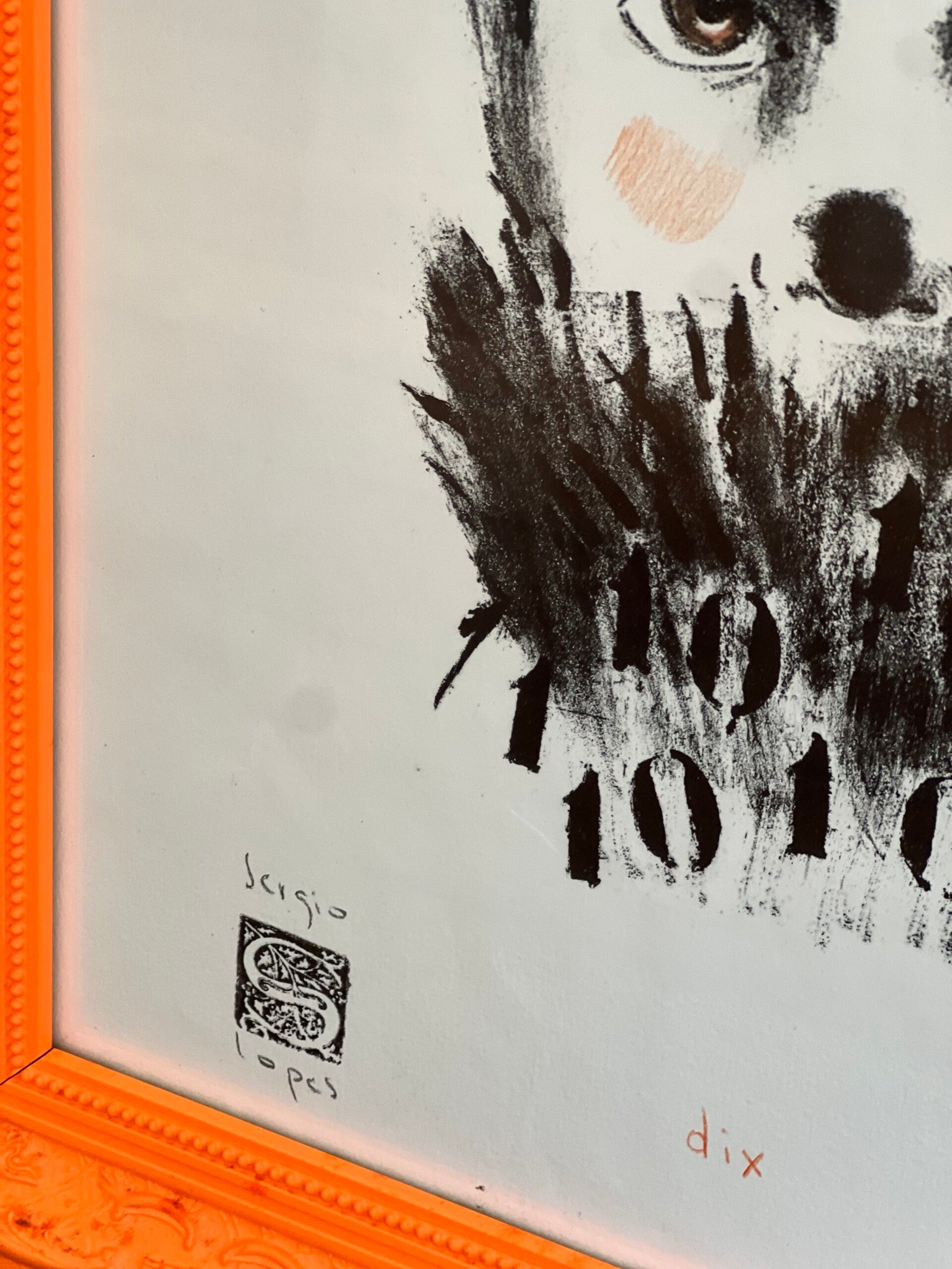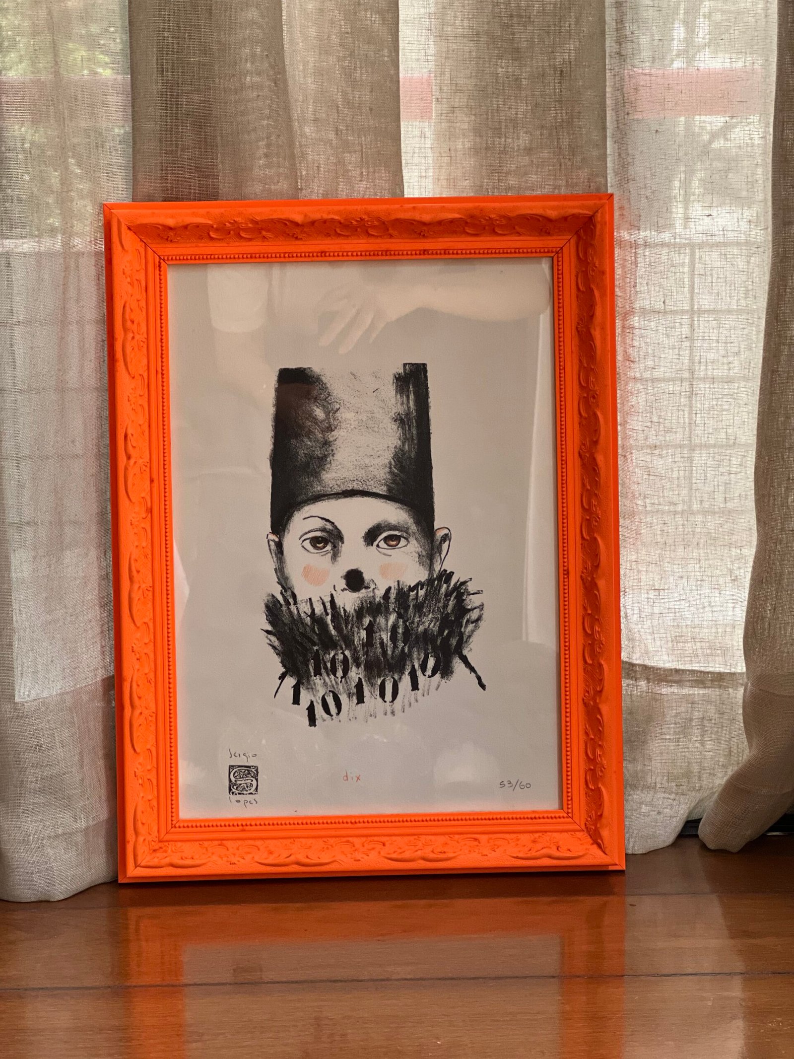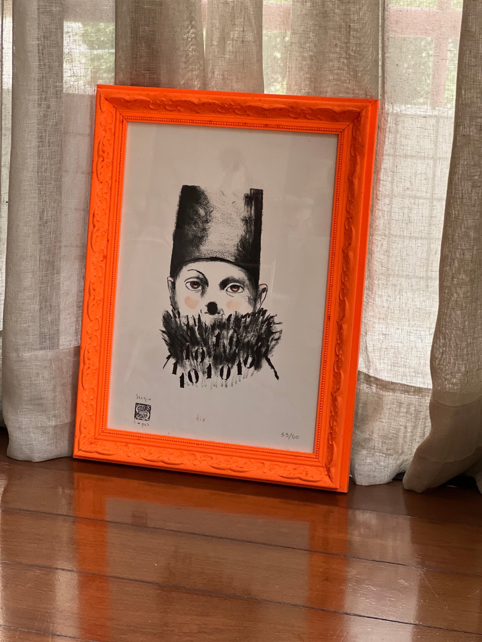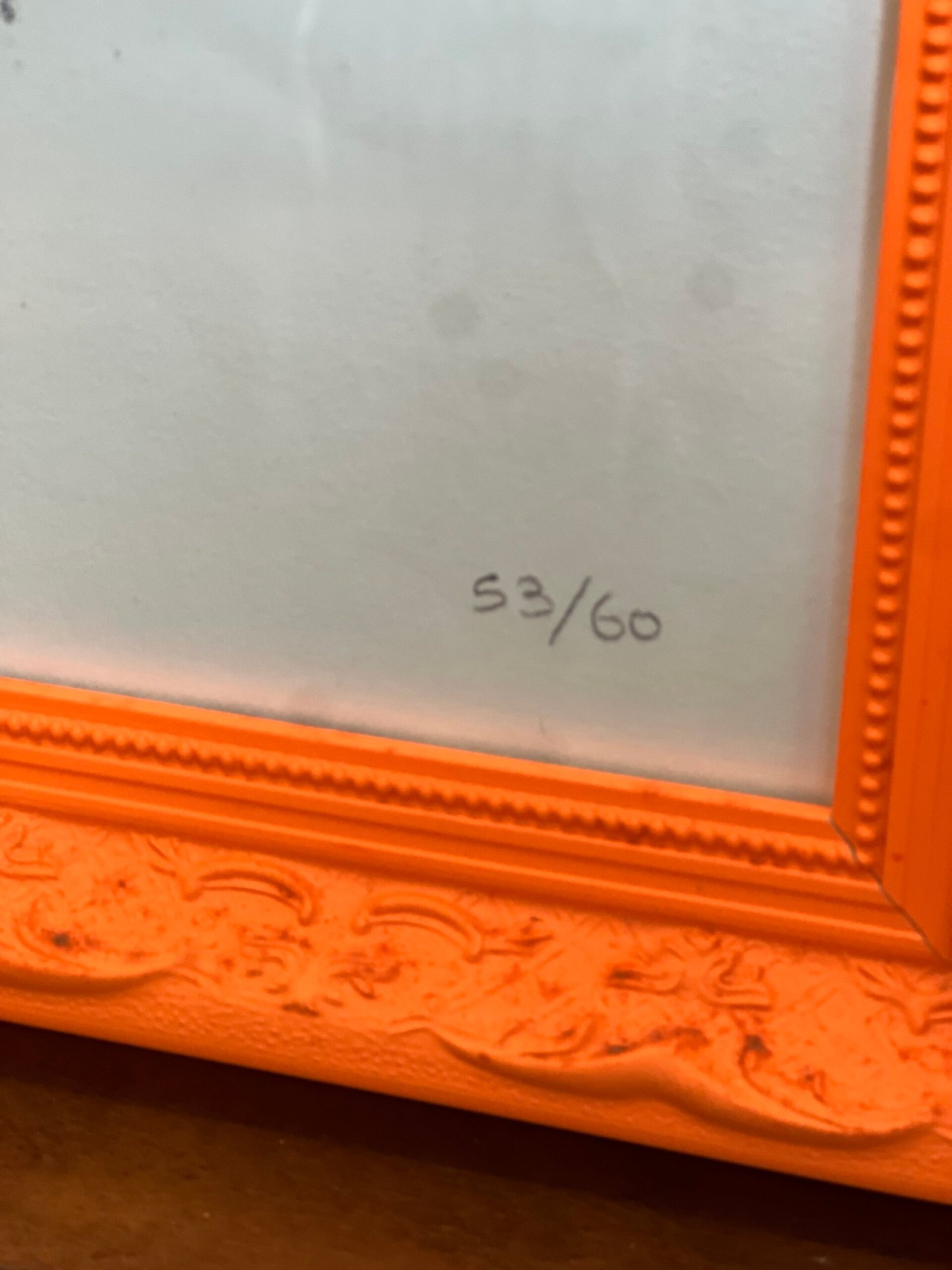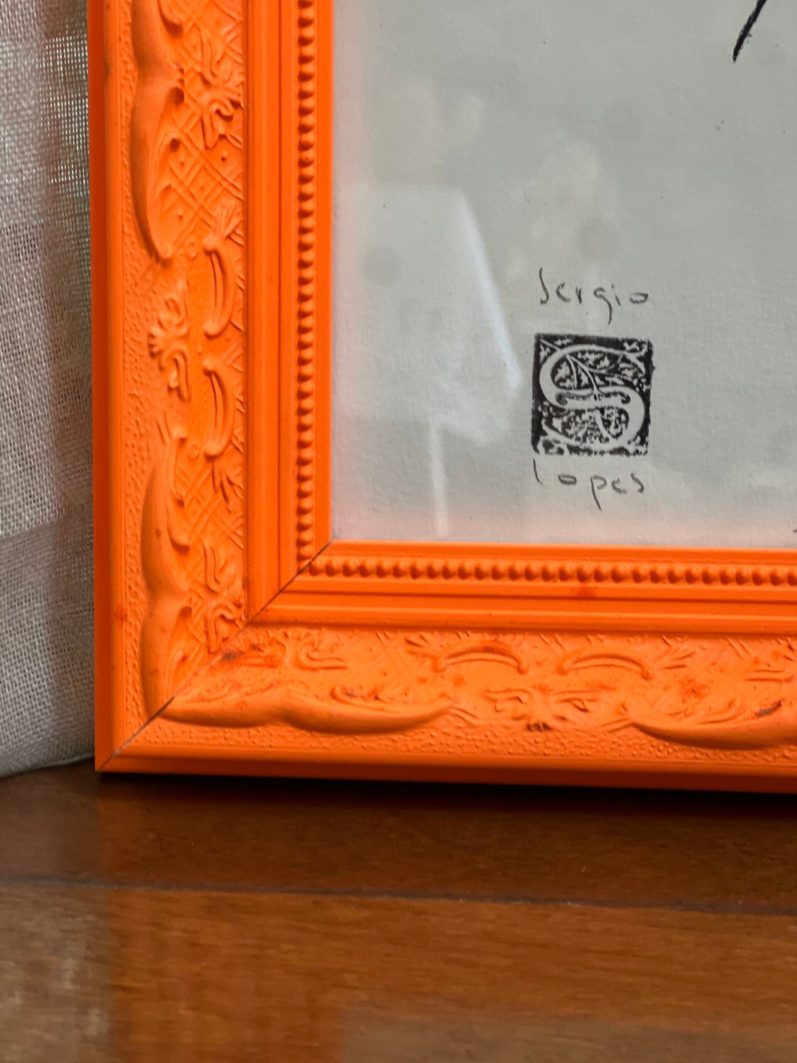Cód: cemartsp69 DESCRIÇÃO: Quadro Artista: Sérgio Lopes Tiragem 53/60 Moldura em madeira na cor laranja neon