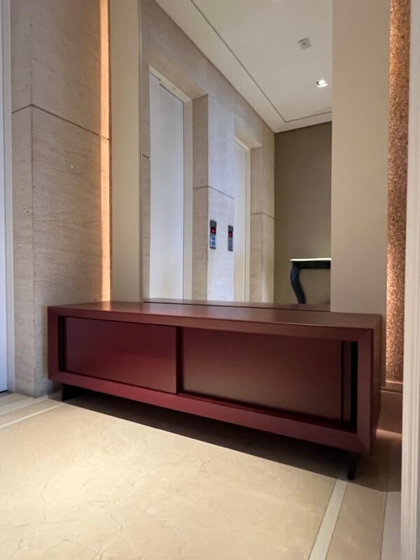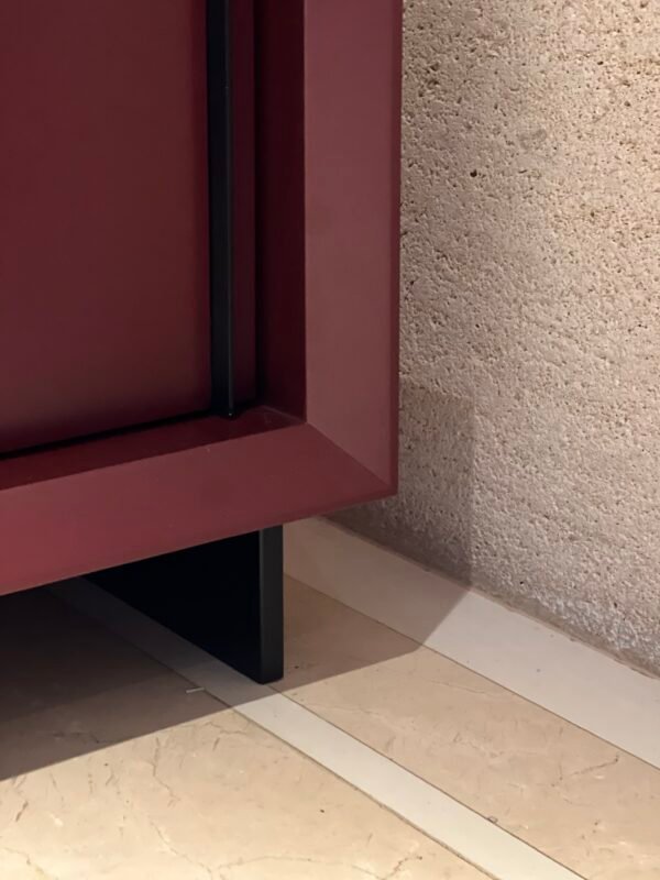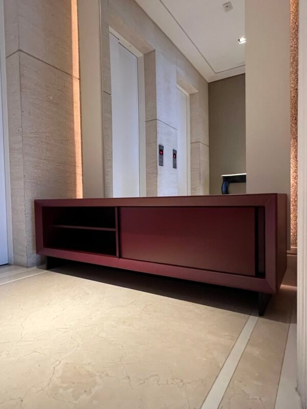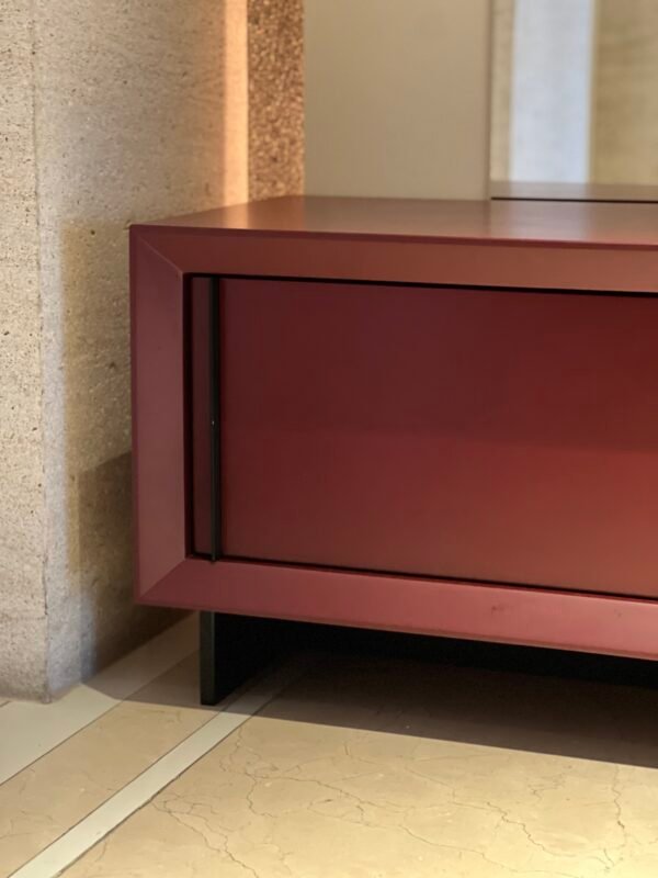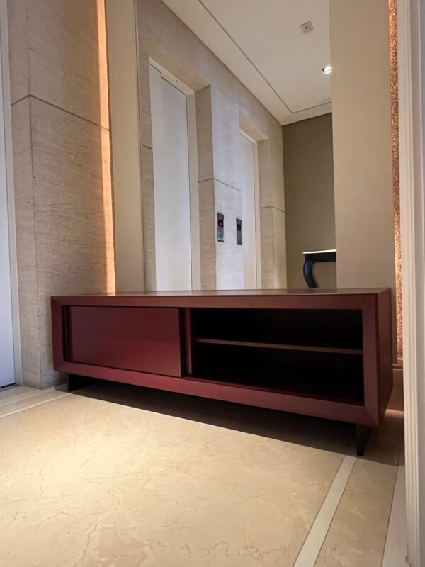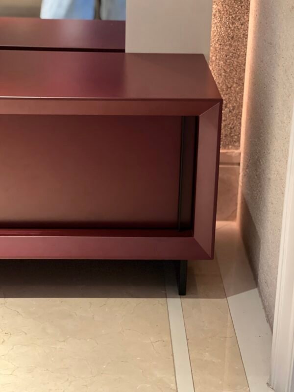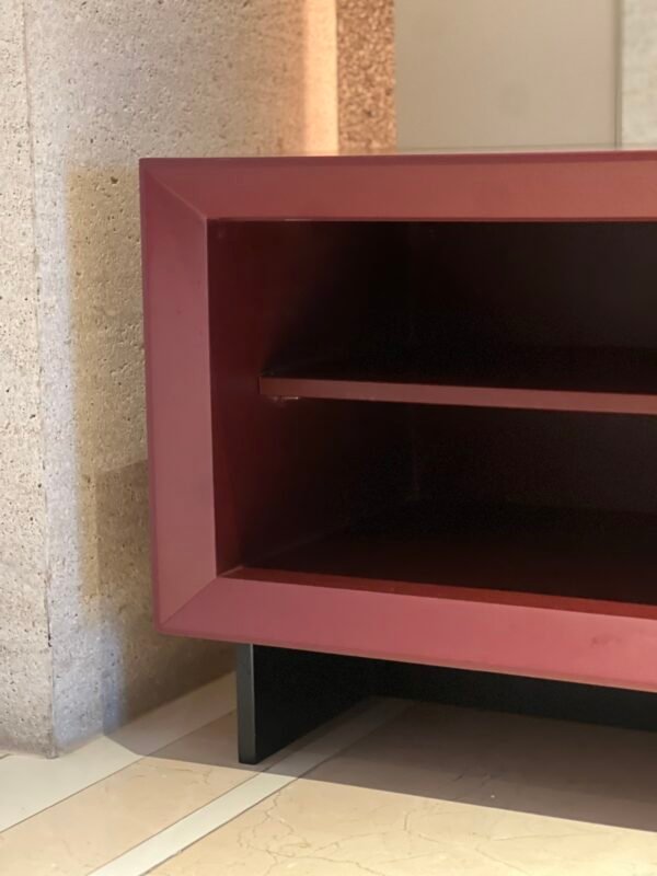 Cód: alighsp21 DESCRIÇÃO: Rack 02 portas de correr 02 prateleiras Estrutura: madeira Acabamento: laca fosca Cor: bordo