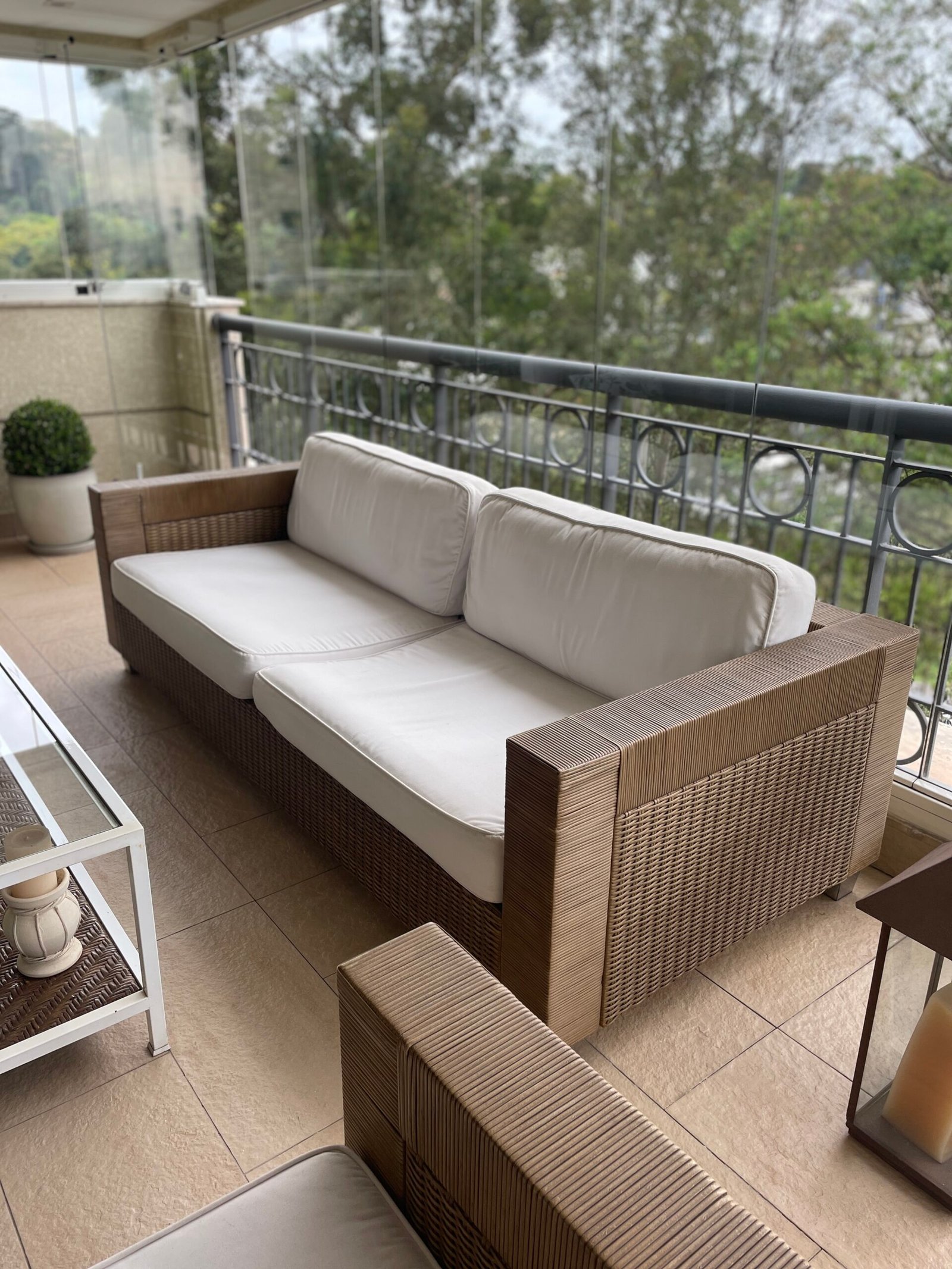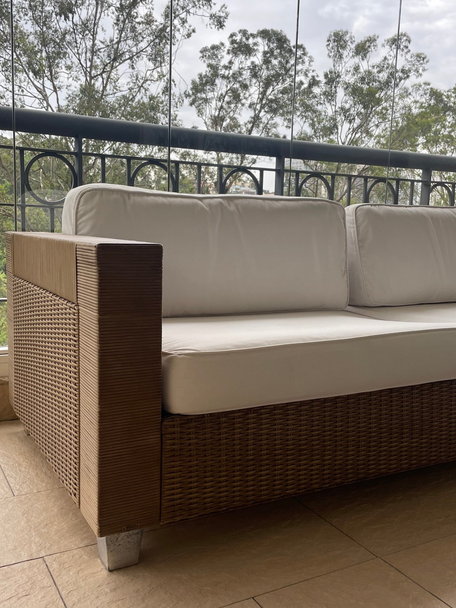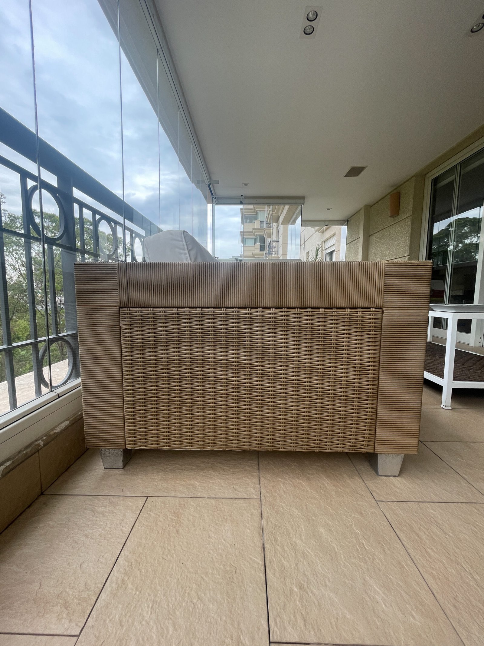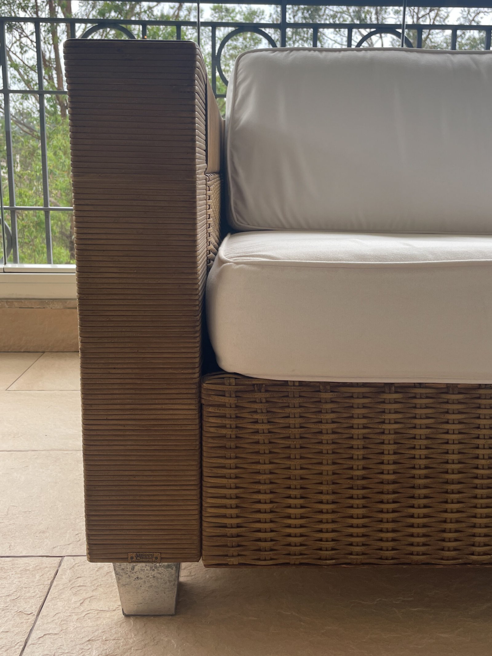 Cód: samollisp01 DESCRIÇÃO: Sofá Pés em alumínio Estrutura: madeira Acabamento: rattan Tecido: sarja Cor: off white