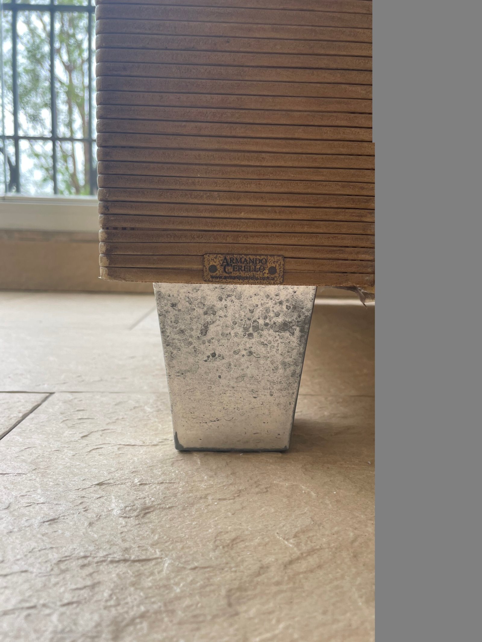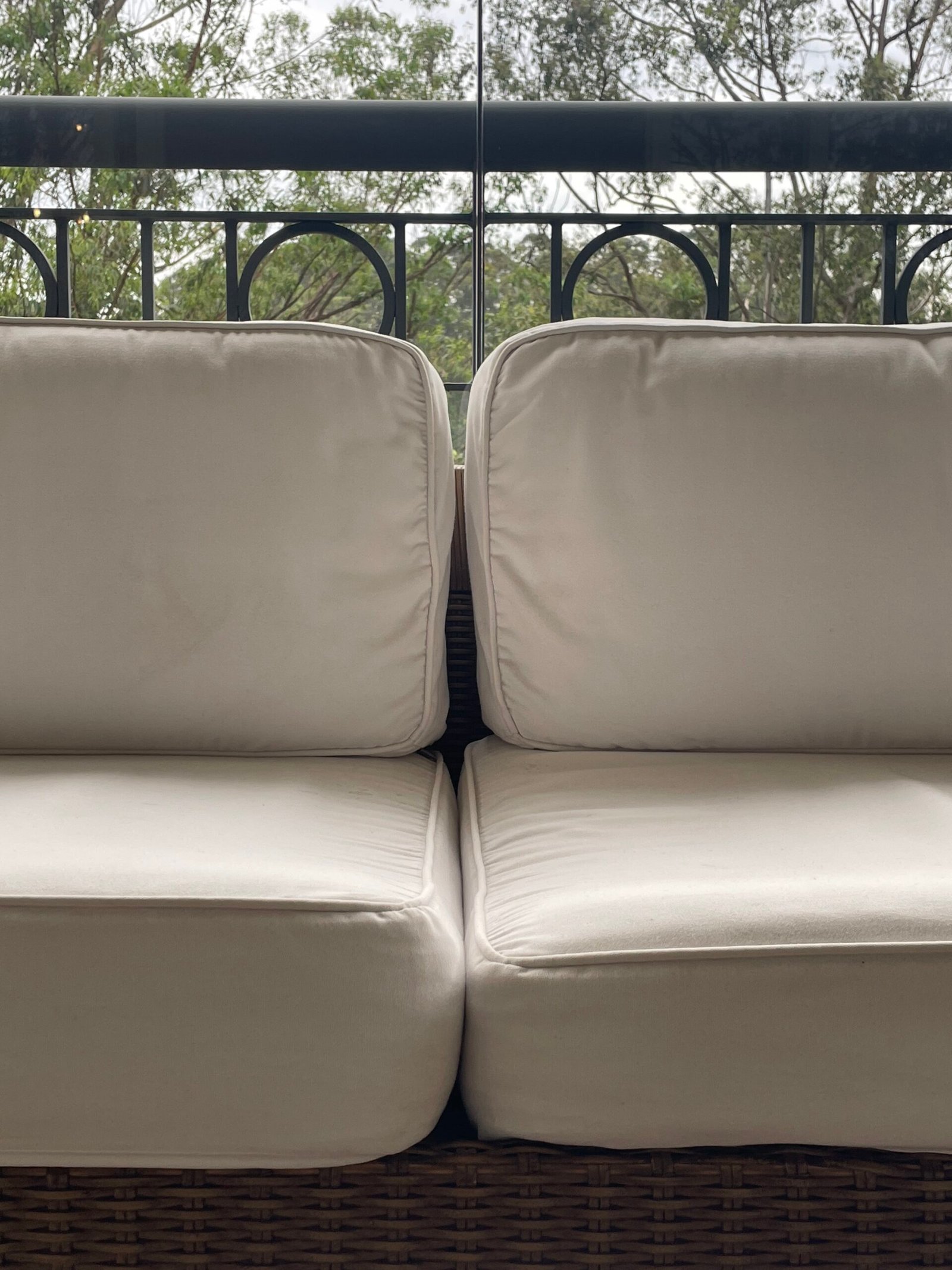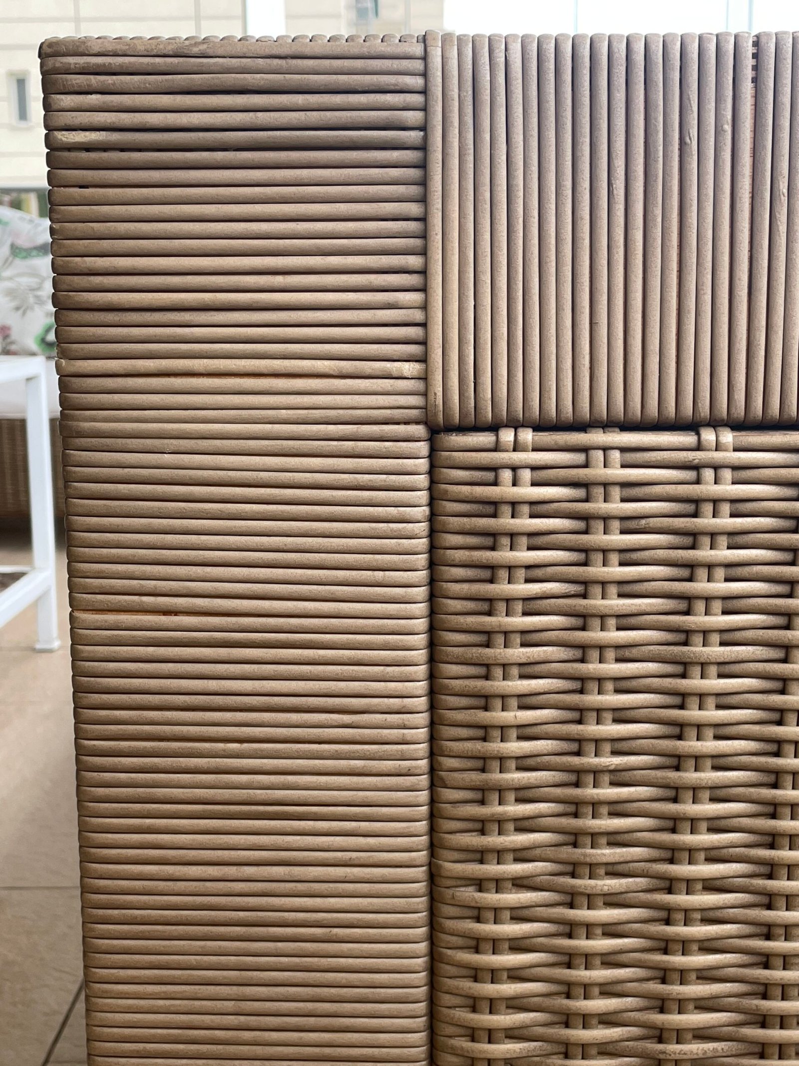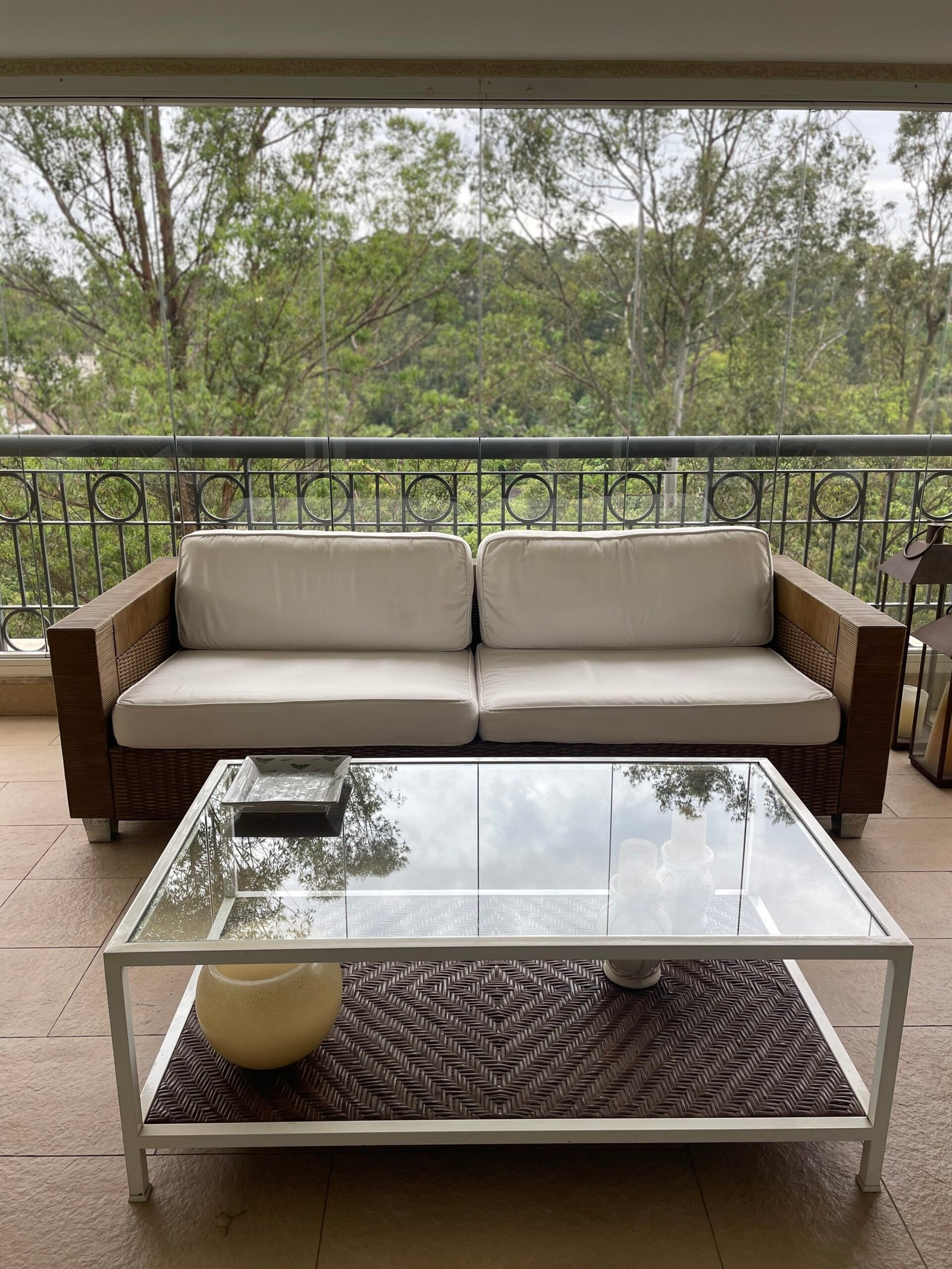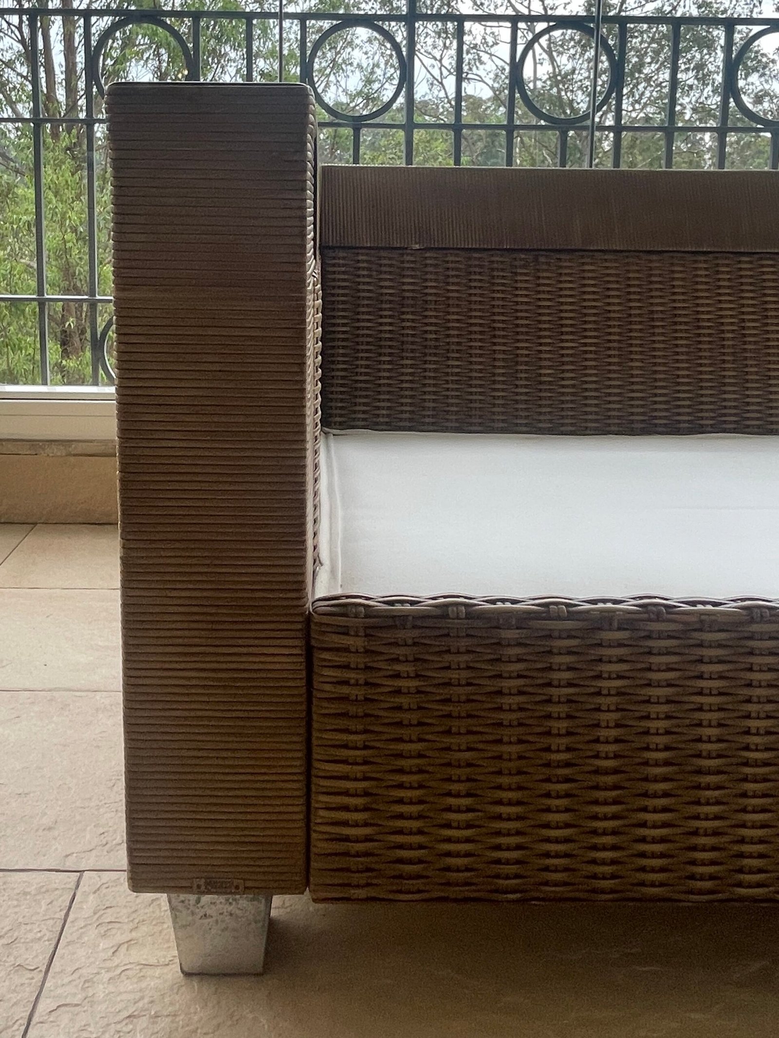 Cód: samollisp01 DESCRIÇÃO: Sofá Pés em alumínio Estrutura: madeira Acabamento: rattan Tecido: sarja Cor: off white